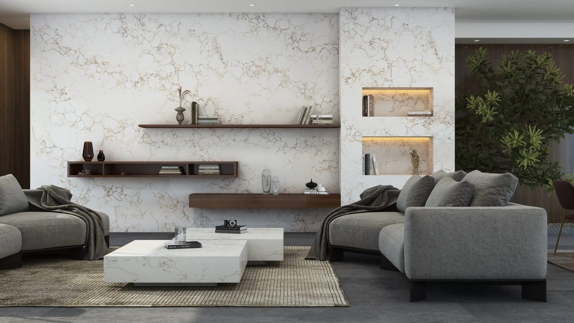 Like the rich veins of minerals found in untouched canyon walls, Enza Oro exudes warmth with its golden veining cascading over a creamy, marble-like backdrop, offering an elegant nod to nature’s raw beauty.
