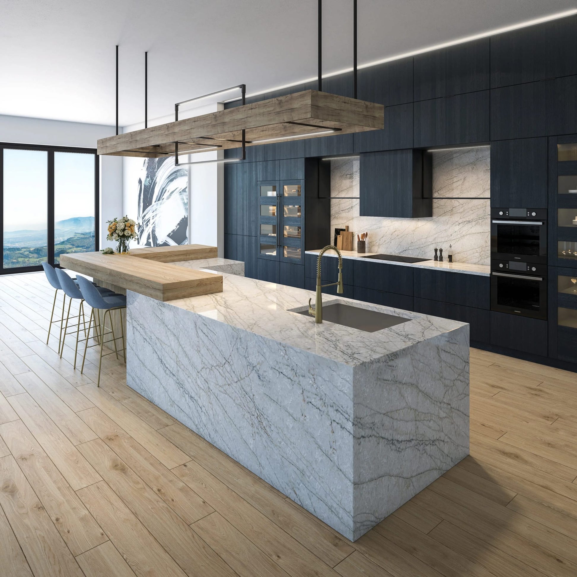 Designed to mimic the natural flow and brilliance of cascading water, our Oceanus quartz (Backlit) slab emulates the exquisite beauty of a natural quartzite. With its captivating blend of deep blues, greys and subtle rust vein pattern, this slab offers an aesthetic that is both playful and cultured.