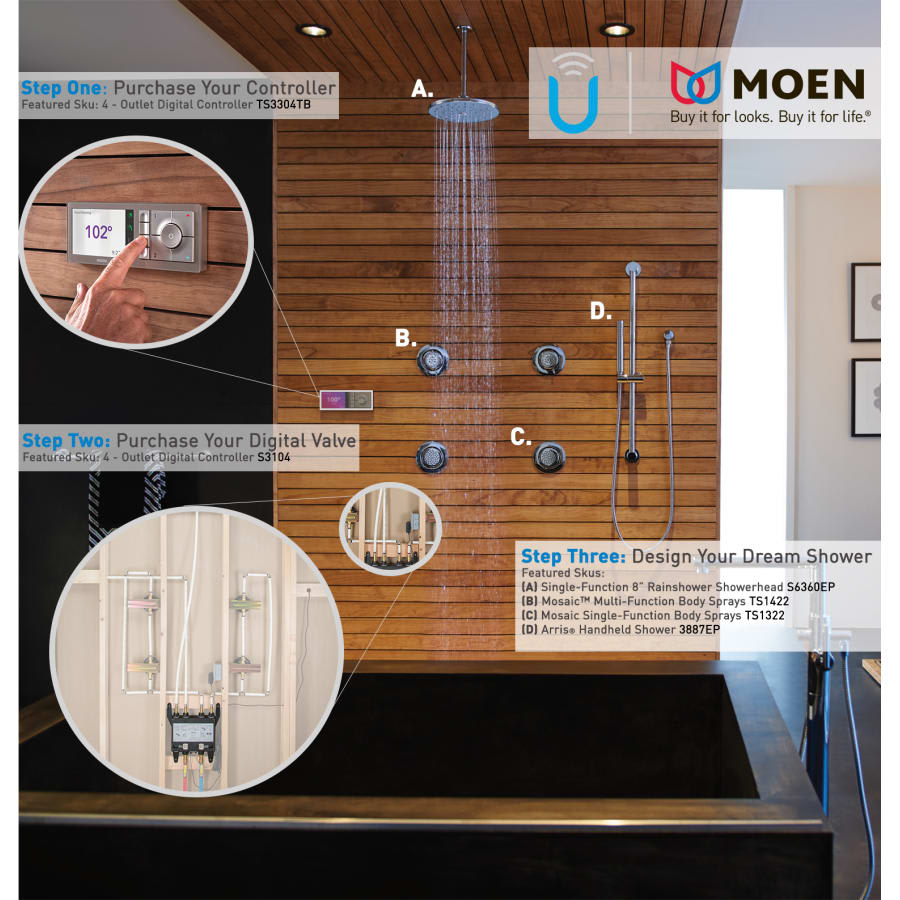 The Smart Shower is a Wi-Fi enabled digital shower that offers mobile connectivity and unmatched personalization, providing countless ways to create your ideal showering experience. The Smart Shower allows you to activate your shower in 3 different waysâvoice controlled through a smart speaker, the Moen Smart Water App, and the in-shower controller. Within the smartphone App, you can create up to 12 personalized presets including name, greeting, outlets used, water temperature, shower timer, and notifications, so you have the perfect shower experience every time.