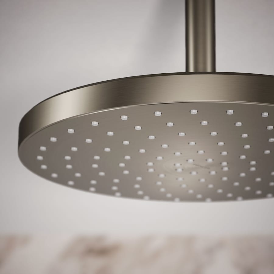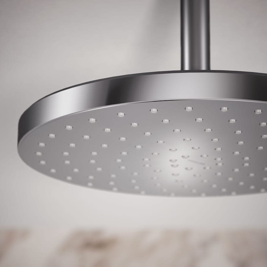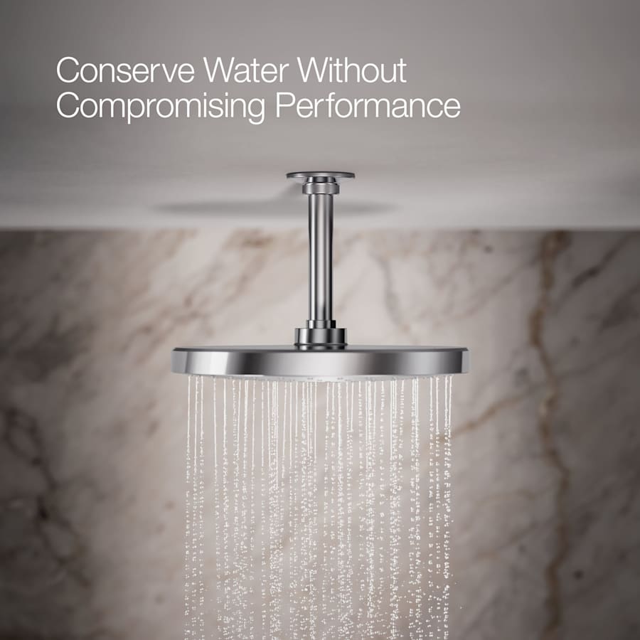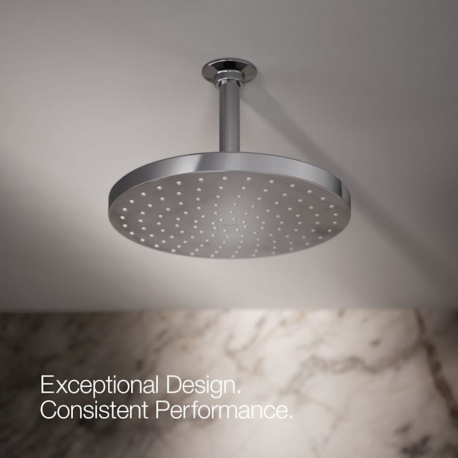 Bring the invigorating freshness of a summer rain to your shower with the Awaken rain head. An optimized spray face with angled nozzles generates a uniform spray pattern with wide, even coverage, simulating the experience of walking in a warm Rain shower. The Awaken rain head can be installed on a wall- or ceiling-mount shower arm, and a swivel joint allows for precise placement of the spray. Its simple and contemporary design complements the Awaken collection.