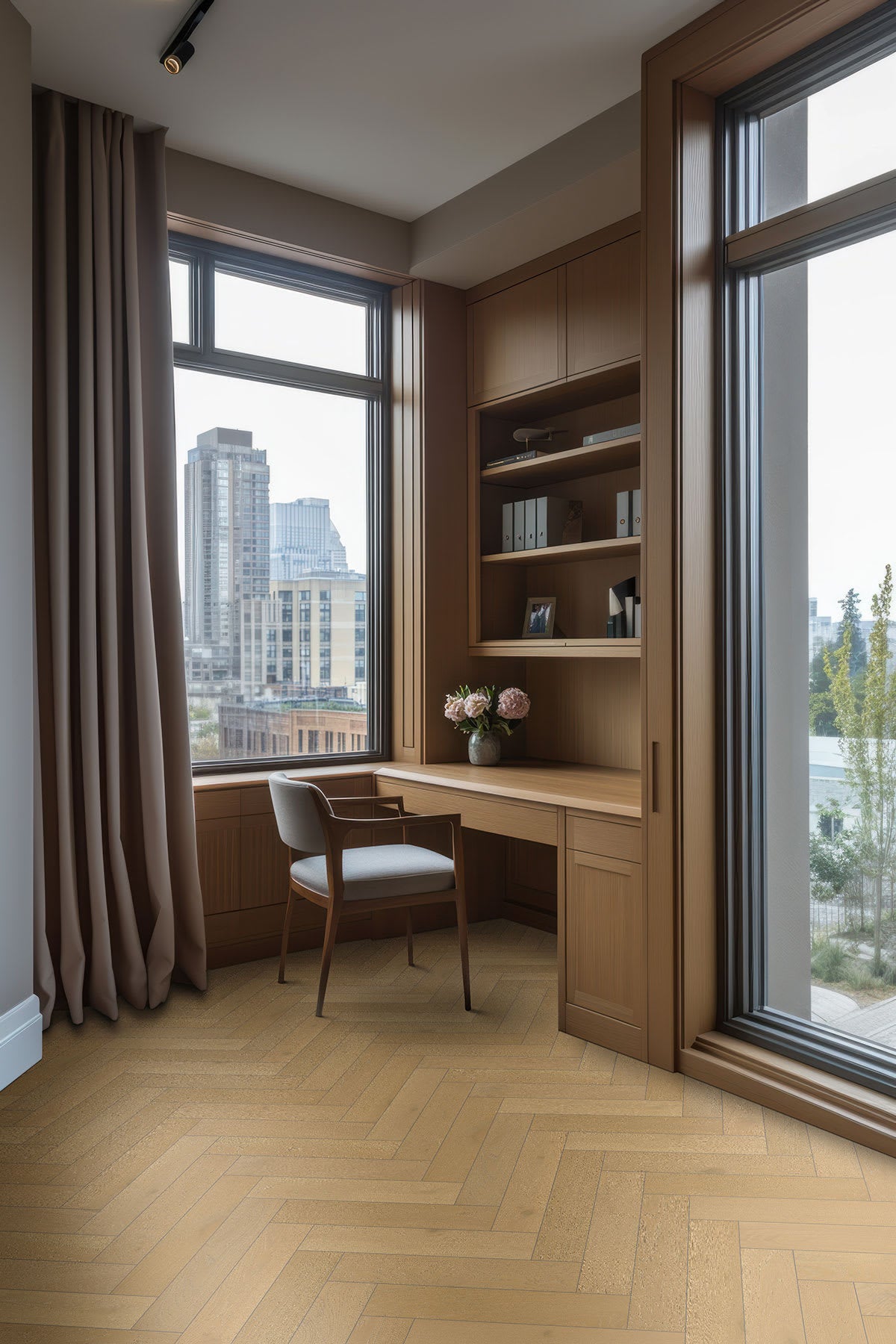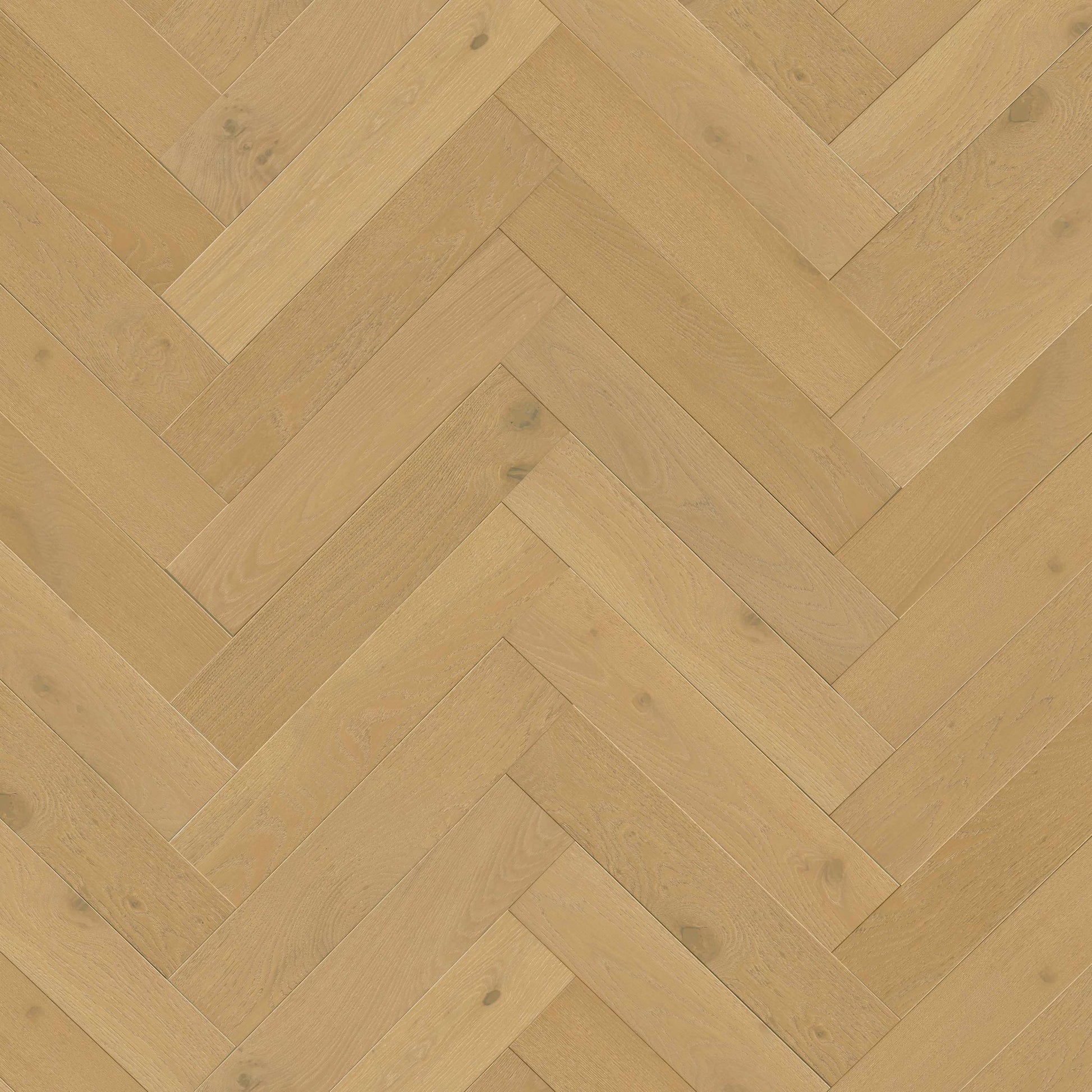 McCarran® Whitlock Herringbone offers a modern interpretation of a classic design. These 5" x 24" engineered hardwood planks showcase serene tan tones, punctuated by organic knots and flowing grain patterns that celebrate the character of European wood. Beveled edges accentuate the artisanal craftsmanship, lending a clean, tailored aesthetic to sophisticated spaces. Engineered with a durable multi-ply core and shielded by CrystaLux Ultra™ finish for lasting protection, Whitlock Herringbone is ideal for residential and boutique commercial settings where enduring style is paramount. Pair effortlessly with McCarran® Whitlock planks to create a cohesive, designer-level statement throughout the home.