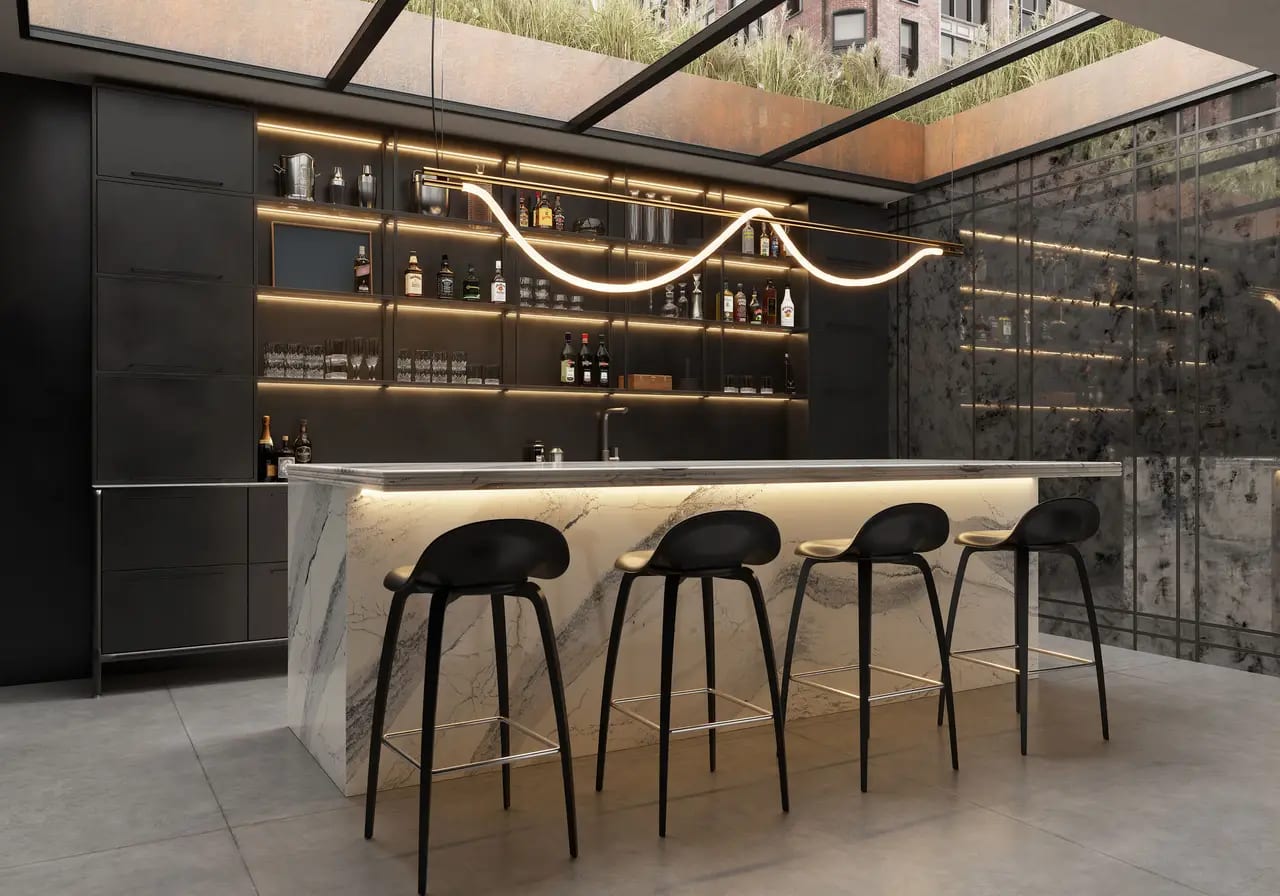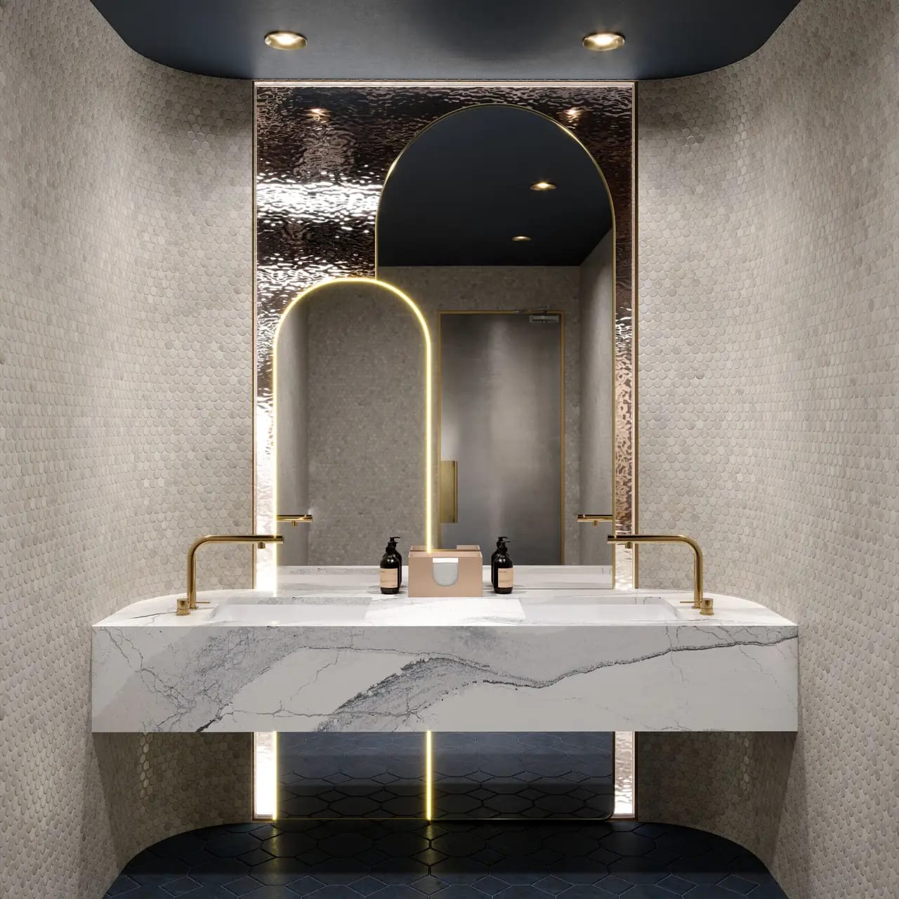 Captivating textures reach new heights—and depths—in this design. Alive with bold movement and balanced texture, the steel-toned colorways ebb and flow like waves against warm honey sand. Steel alloy traces each crest like gleaming sunlight, while cool charcoal contrasts the warm-white debossed Inverness™ veins.