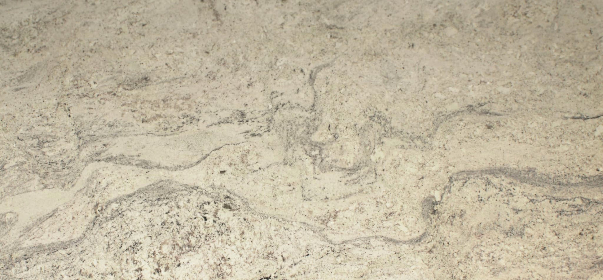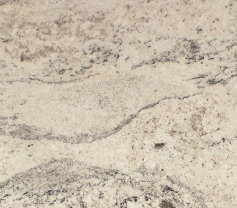 Creamy granite with dramatic long, sinuous greyish veins and dark patches.
