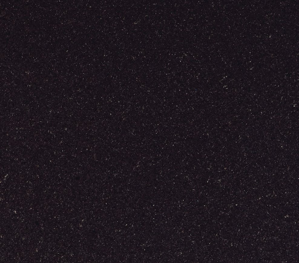 Black, fine-grained granite. Some of its shades are blacker, some dark grey. Its fine, metallic grains also stand out.