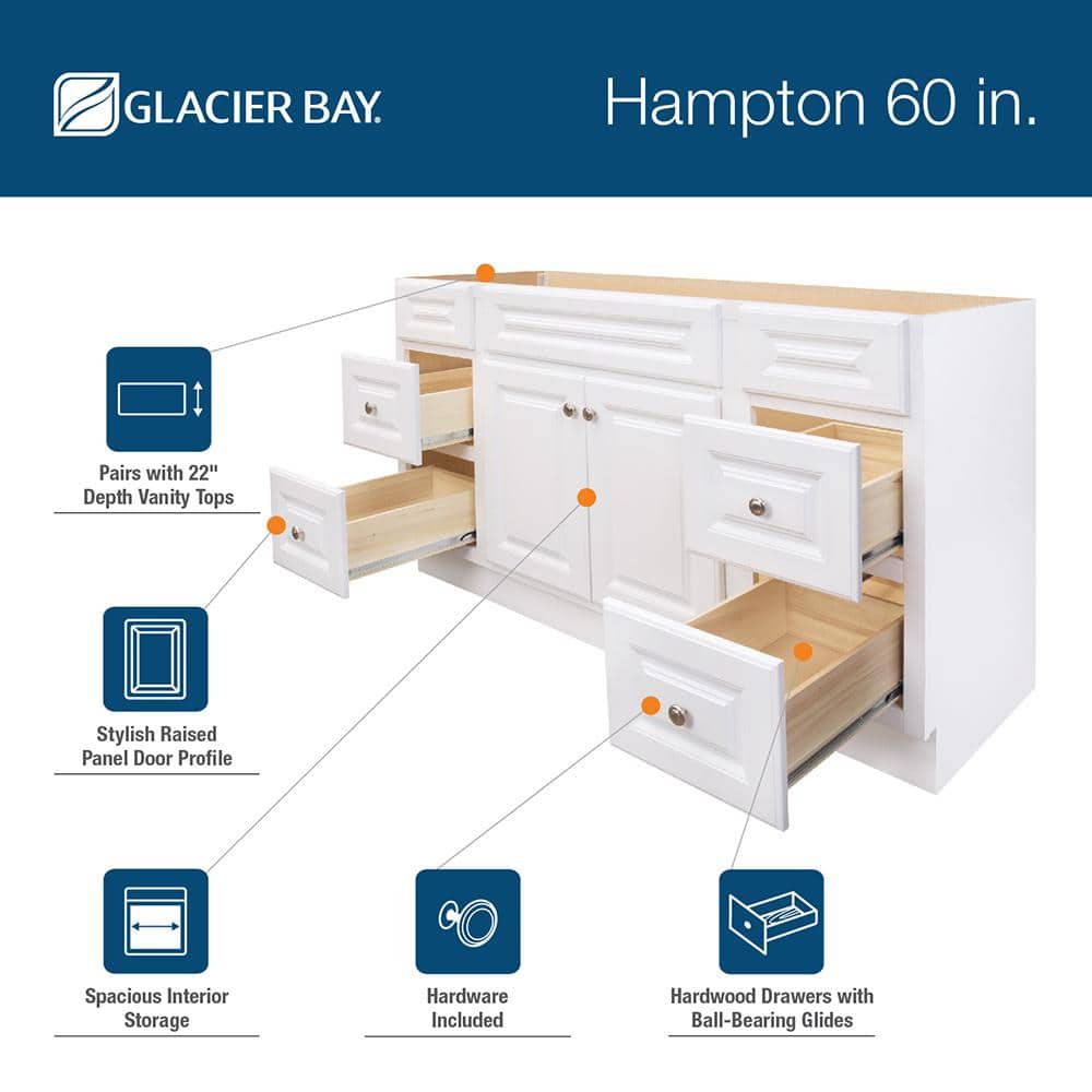 This Glacier Bay Hampton 60 in. Vanity Cabinet Only in White features 4-drawers with ball-bearing glides. The Vanity has 2-doors with a traditional design that will add a bright, classic look to your bathroom. This wall-mounted vanity cabinet can accommodate either a single-bowl or double-bowl vanity top (not included).