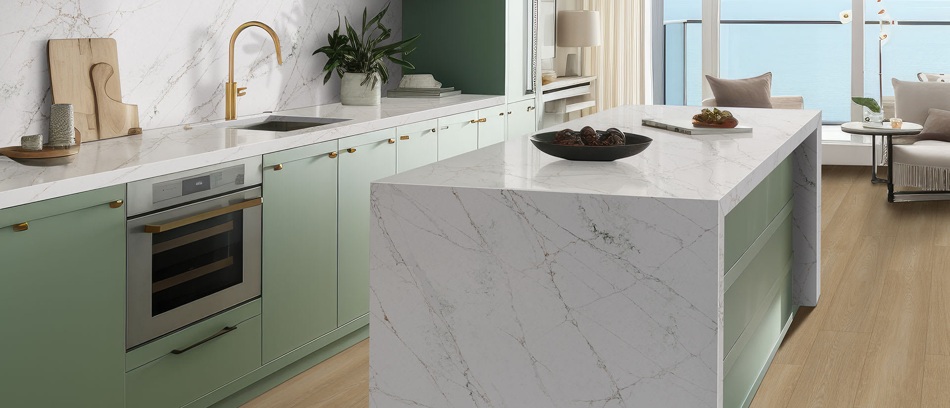 Featuring a warm white background with brown and green wispy veins beautifully intermingled, Calacatta Viraldi® provides a neutral yet welcoming design that complements an array of color palettes. The enhanced naturalism of this quartz is perfect for various applications including statement kitchen islands, walls and other areas throughout your space where a touch of flair is appreciated. With MSI’s exclusive LumaLuxe® formulation, this quartz enhances how light interacts with the surface for ultimate eye-catching and immersive results. Add the stunning Calacatta Viraldi® to your residential or commercial interiors to help make any room stand out no matter the occasion.