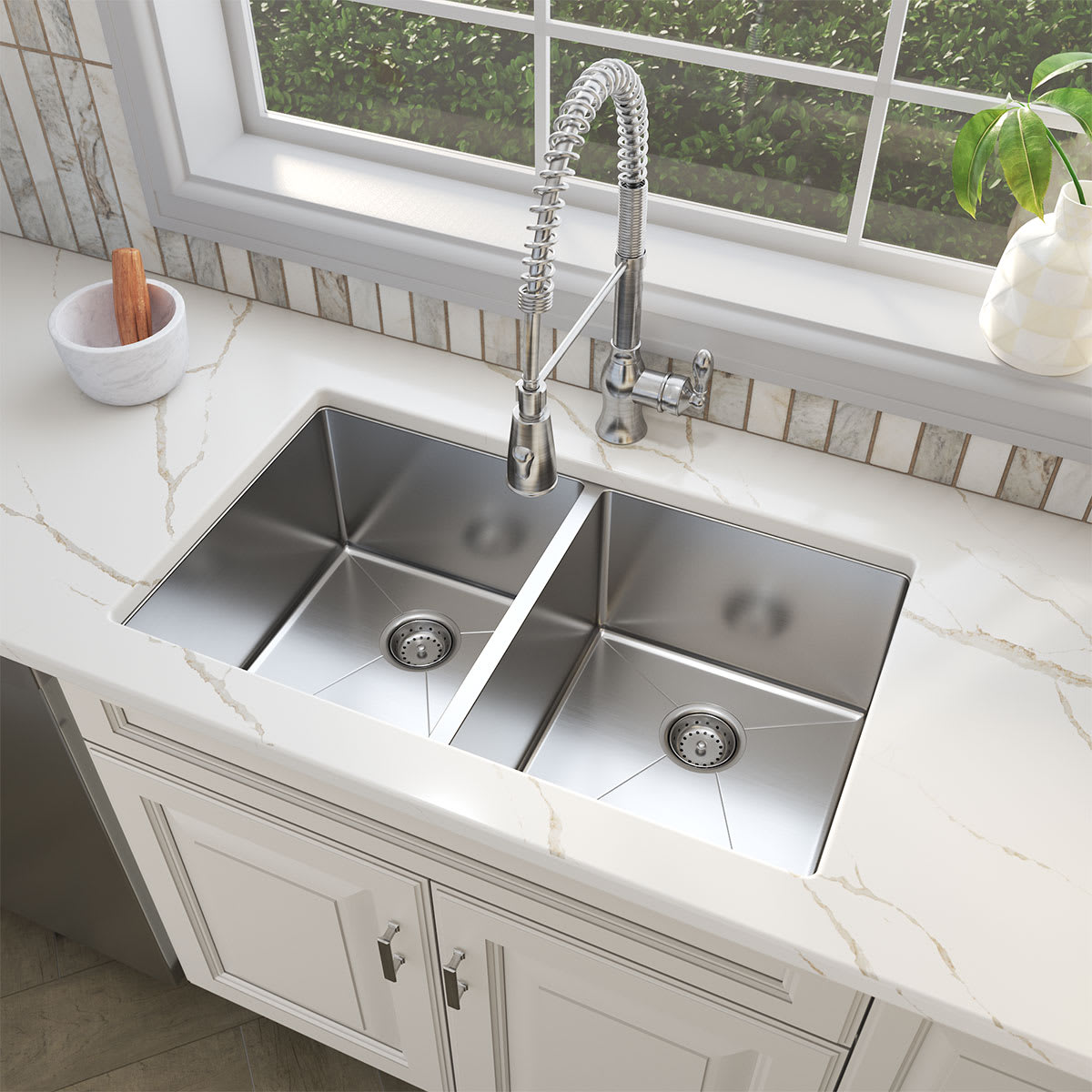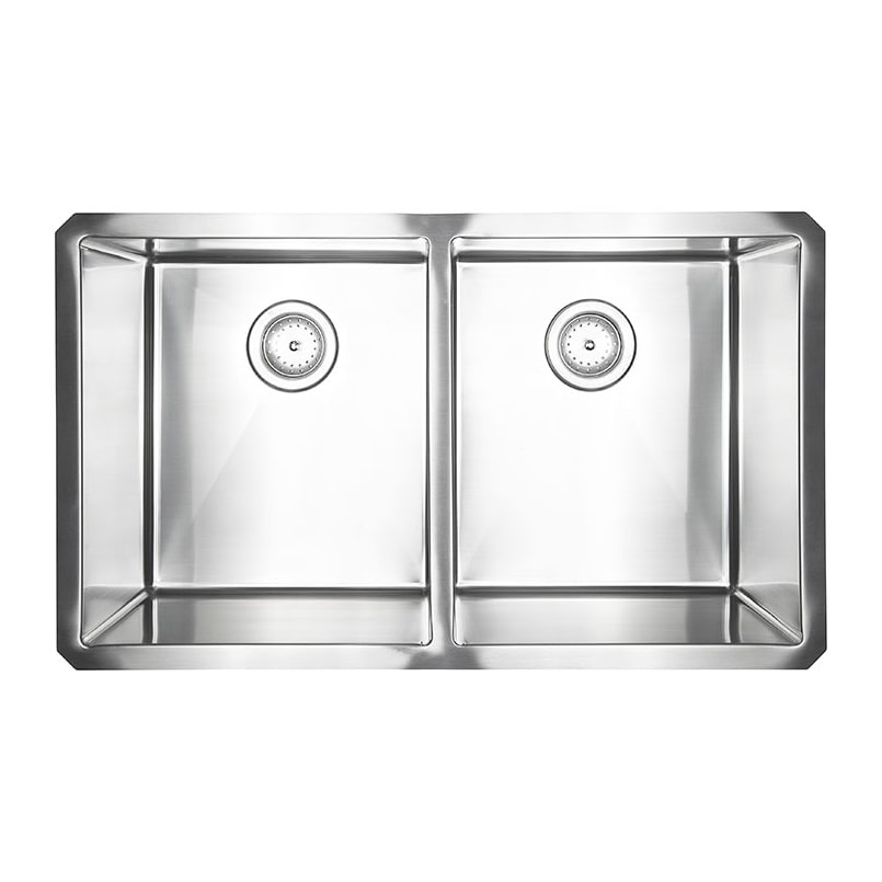 This hardworking handcrafted double bowl undermount sink is constructed with strong 16-gauge stainless steel for reliable durability. With two equally sized deep basins (10” each), this sink is there for you when you need it. Big family dinners? No problem. It can handle oversized cookware like stockpots, slow cookers, and baking sheets. An ideal choice for busy homes and light commercial environments, this easy to clean sink offers sound shielding pads as well as a beautiful brushed satin finish that helps minimize water spots and small scratches. Long lasting quality and elegance come together in this popular double bowl stainless steel sink. Backed by a limited lifetime warranty with matching grids available.