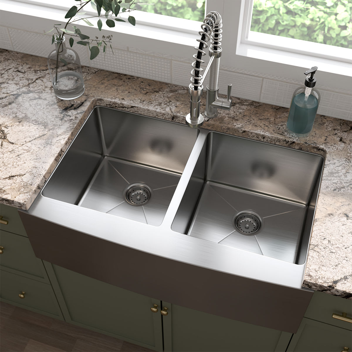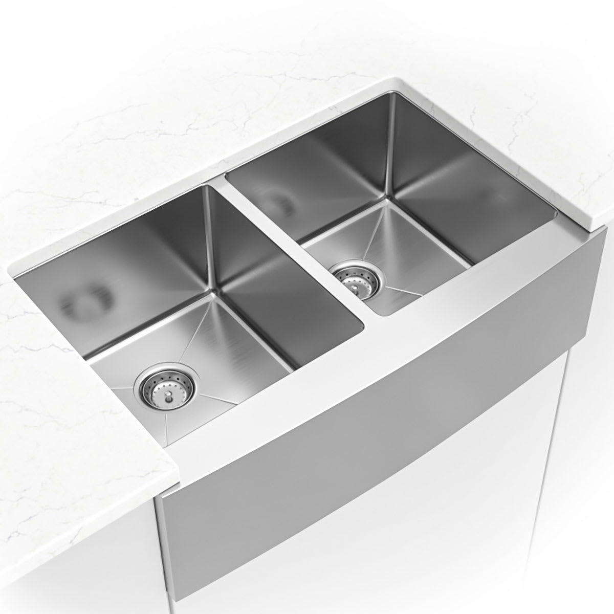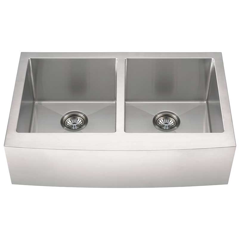 This handcrafted double basin undermount sink features a beautiful curved apron for that sought-after finished look. Constructed with 16-gauge stainless steel for reliable durability, it offers two equally sized deep basins (10” each). Big family dinners? No problem. This hardworking sink can handle oversized cookware like stockpots, slow cookers, and baking sheets. An ideal choice for busy homes and light commercial environments, this sink includes innovative sound shielding pads to help improve the washing experience. Its beautiful brushed satin finish makes clean-up a breeze and helps minimize water spots and small scratches. Long lasting quality and elegance come together in this popular double bowl aproned sink.