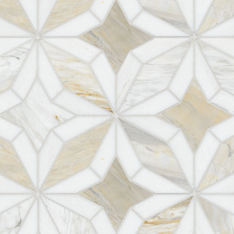 Athena Gold Estrella polished mosaic tile brings a captivating blend of geometric star shapes in warm white and soft gray hues, enhanced by delicate veining throughout. Crafted from luxurious marble, it offers both beauty and durability, while the convenient mesh backing ensures easy installation. Perfect for kitchen backsplashes, bathroom or shower walls, and even residential floors, this tile adds an elegant and modern touch to any space.