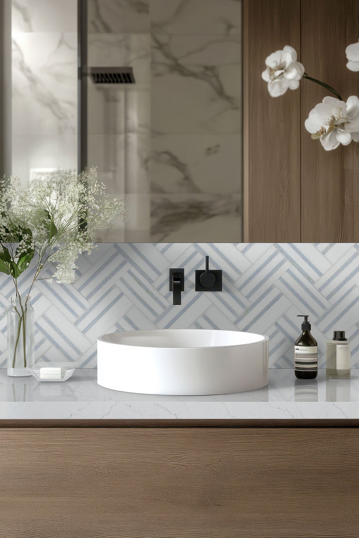 Azula Linea Mosaic Tile features a stunning white marble base adorned with a light blue and gray geometric pattern, creating a striking visual appeal. The polished finish enhances its elegance, while the mesh backing ensures easy installation for a seamless look. Perfect for stylish accent walls, backsplashes, and even residential floors, this tile effortlessly combines modern design with timeless beauty, making it a versatile choice for any interior space.