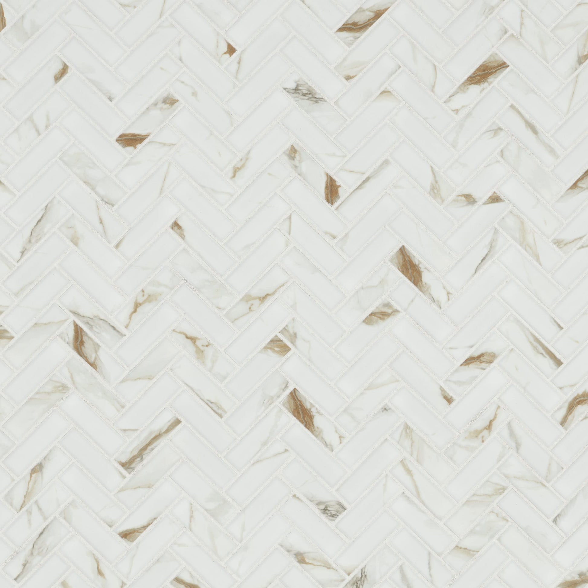 Elevate any space with the timeless beauty of Calacatta Gold Mosaic Tile in a 1” x 3” herringbone pattern. Its warm white background and graceful gold veins create a sophisticated look, complemented by a matte finish for added elegance. Designed with a mesh backing for easy installation, this tile is perfect for accent walls, backsplashes, or residential floors, offering both style and durability.