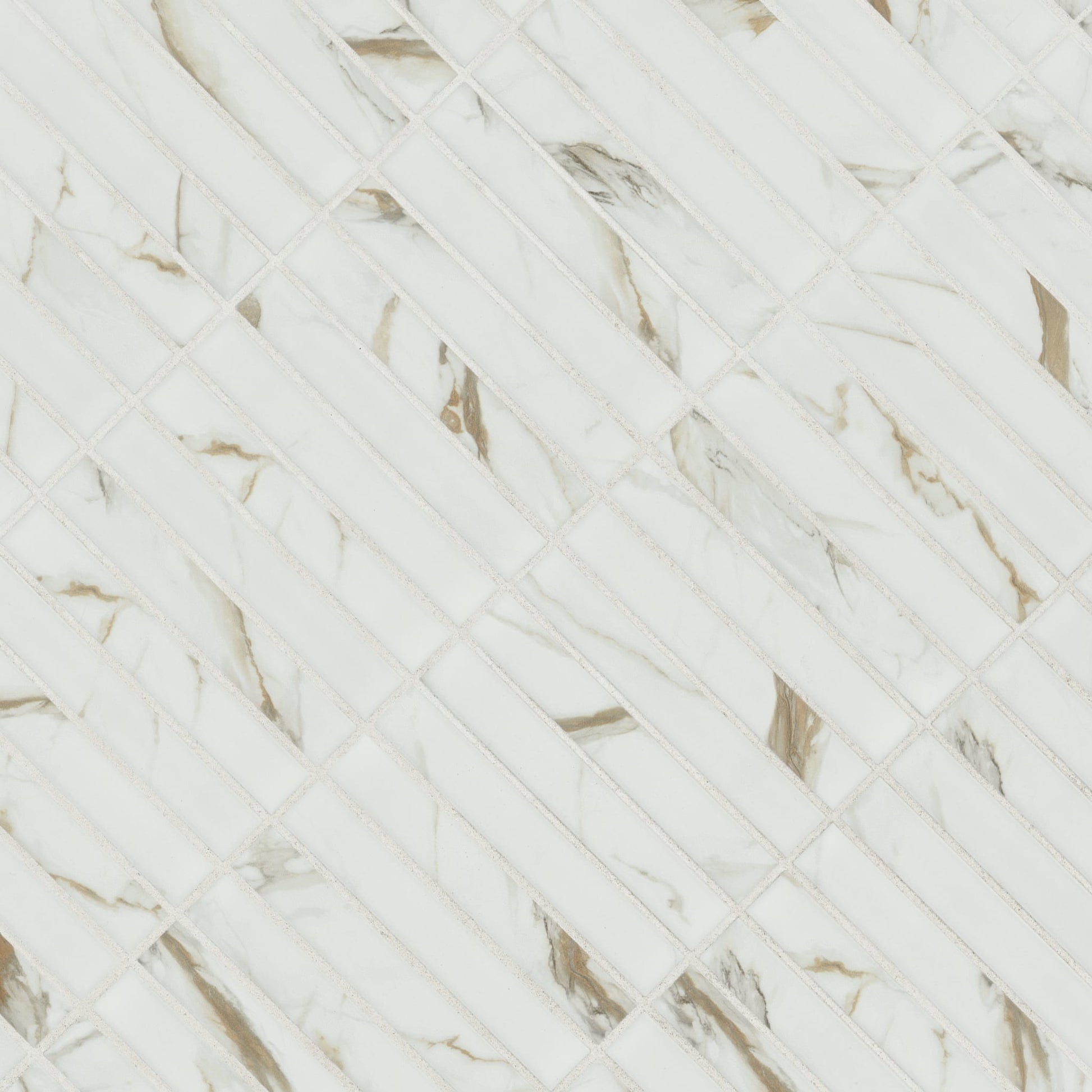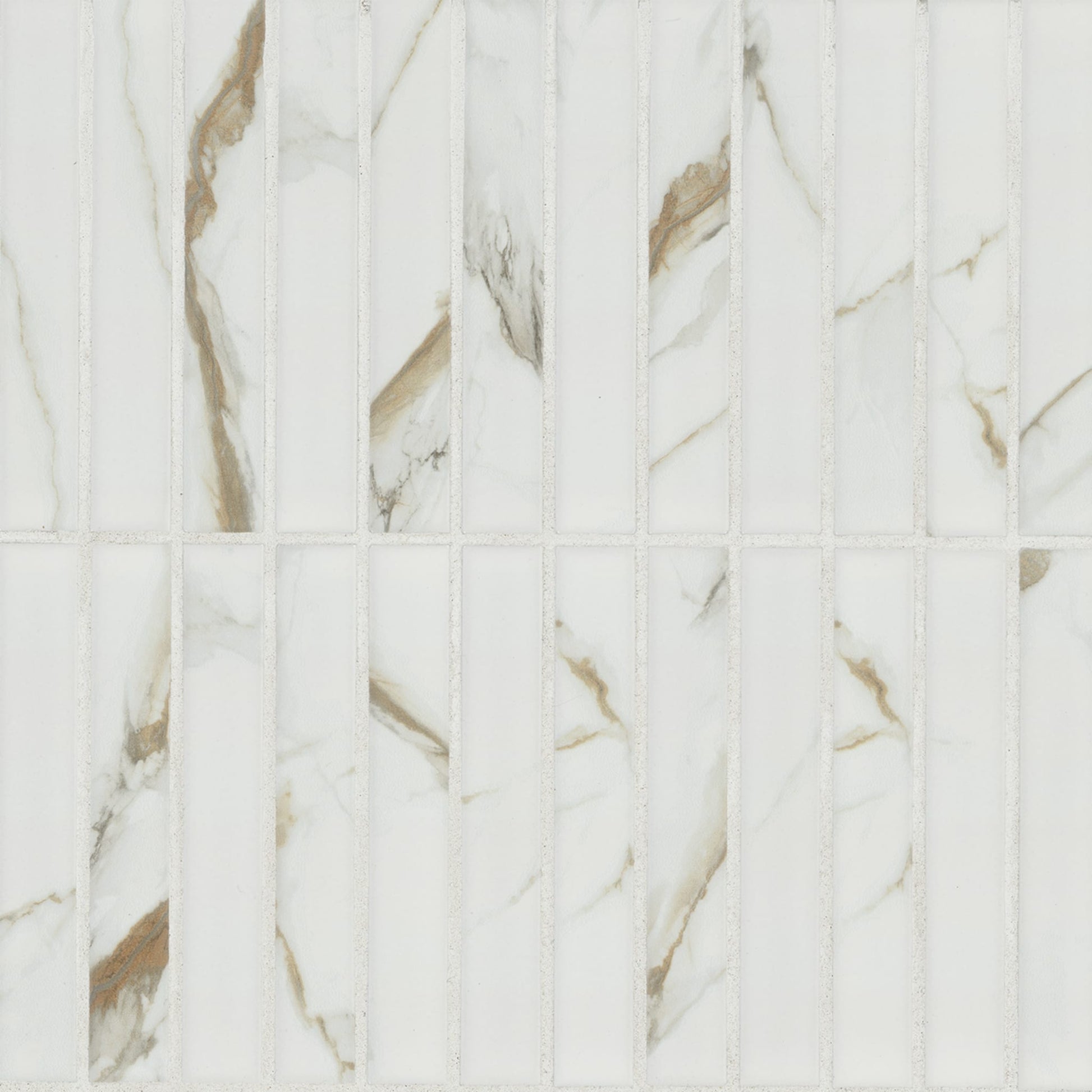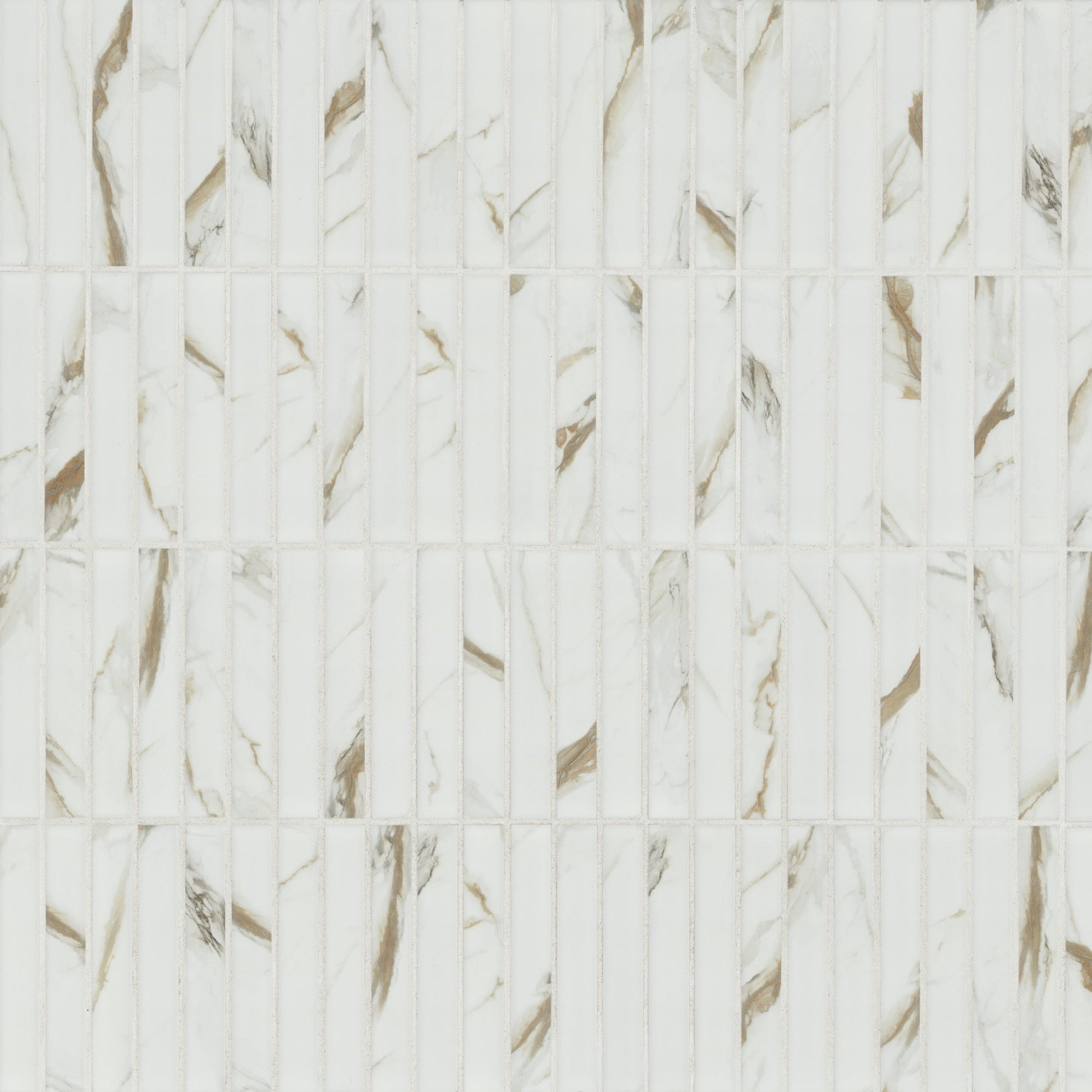 Calacatta Gold Mosaic Tile offers timeless elegance with its warm white background and delicate gold veining. Designed in a 1” x 6” stack pattern, this porcelain tile features a matte finish that adds subtle sophistication to any space. The mesh backing ensures easy installation, making it an ideal choice for accent walls, backsplashes, or even residential floors. Durable and stylish, it’s the perfect solution for elevating interiors with a touch of luxury.