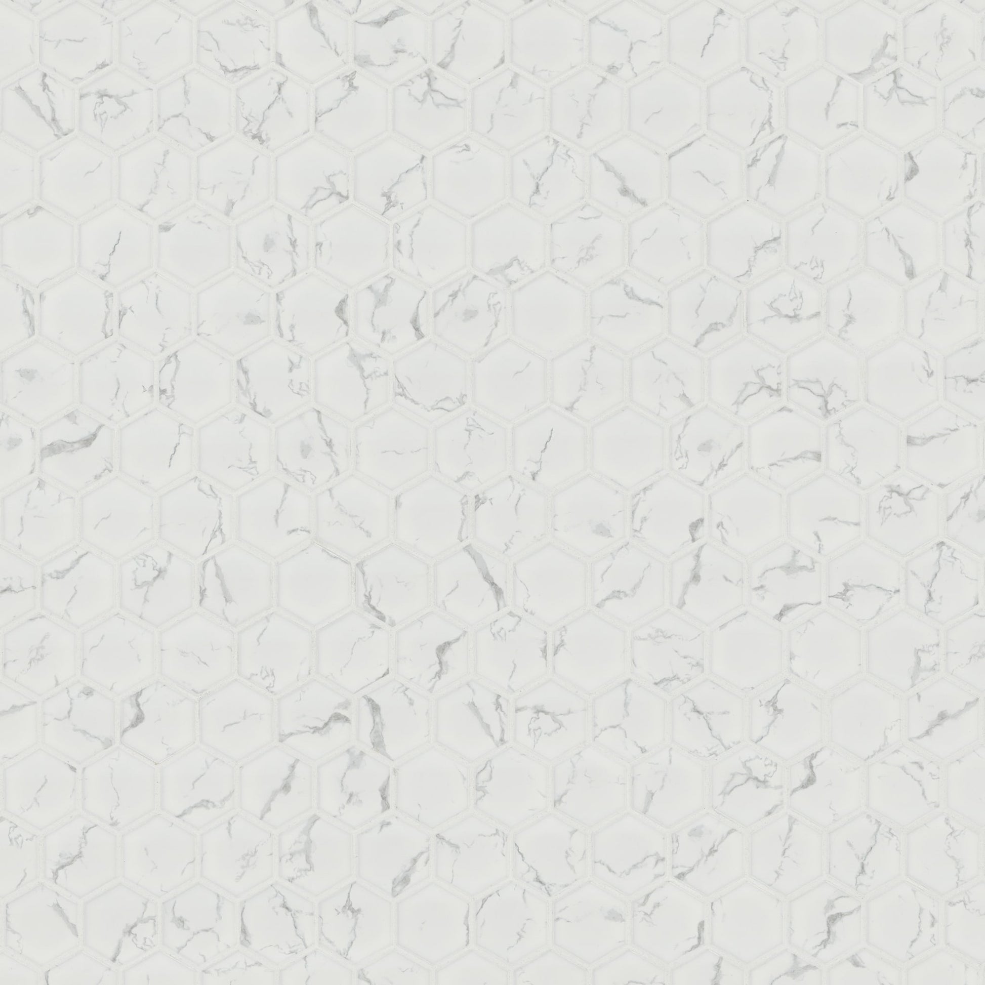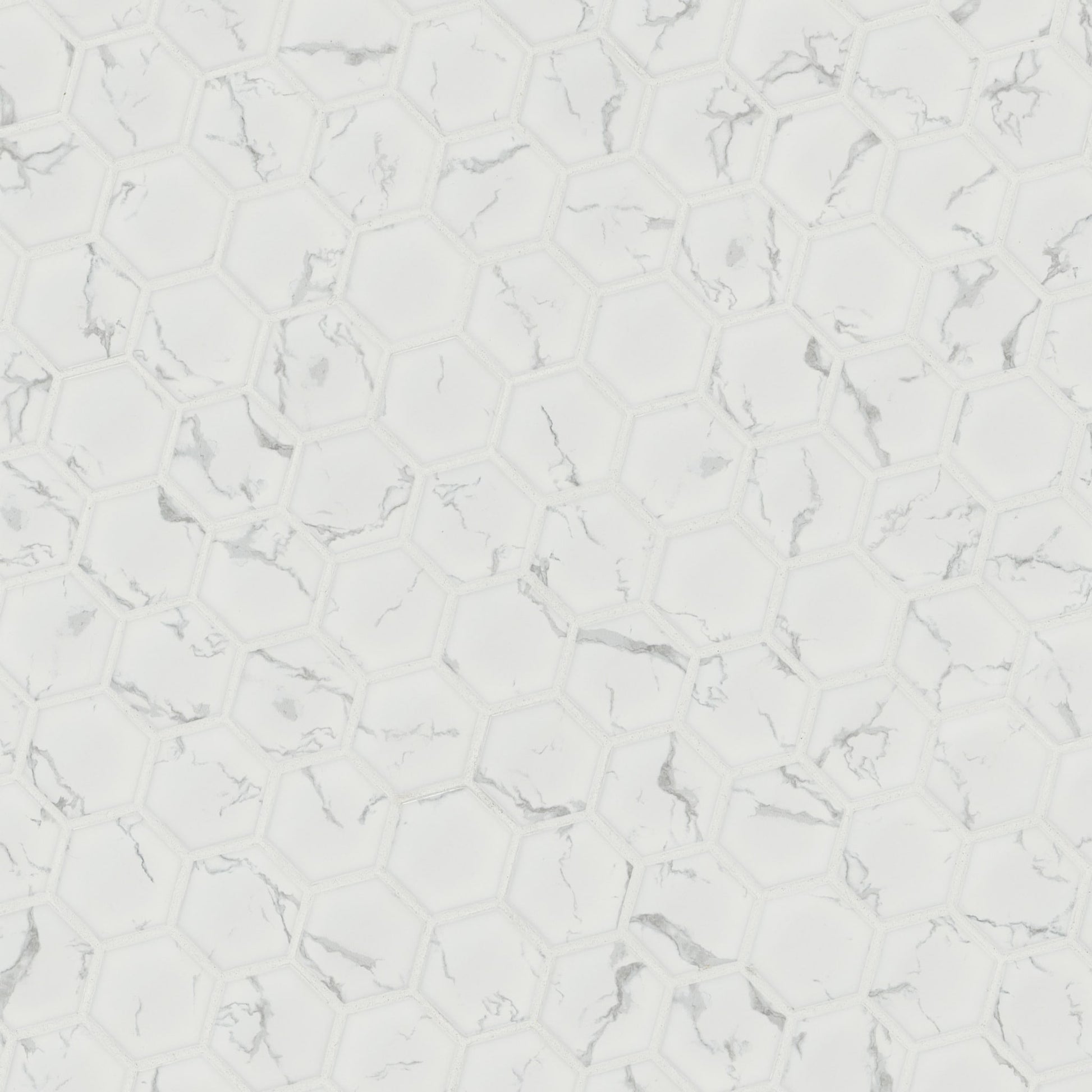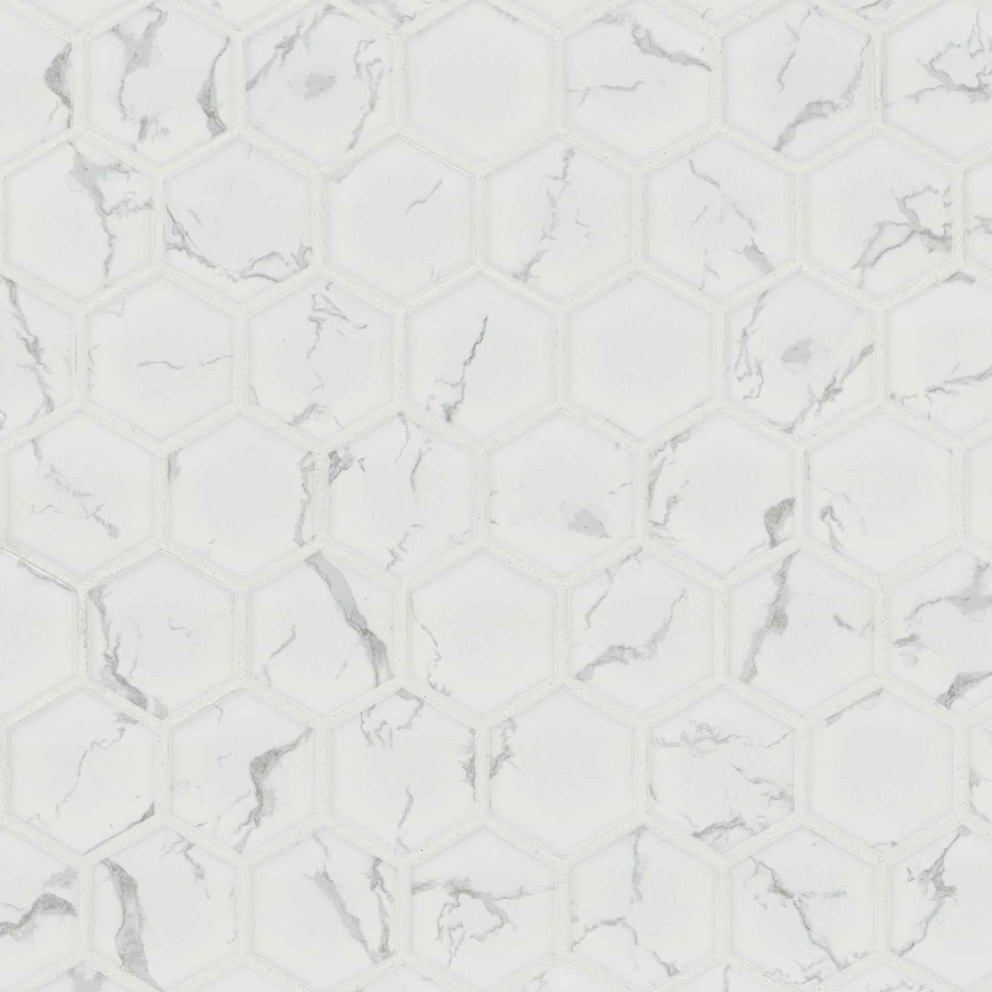 Carrara Mosaic Tile features a classic 2” hexagon design with a cool white background and elegant gray veining, creating a refined, timeless look. The matte finish enhances its subtle charm, while the mesh backing ensures quick and easy installation. Perfect for accent walls, backsplashes, or residential floors, this tile combines style and durability for a polished finish in any space.