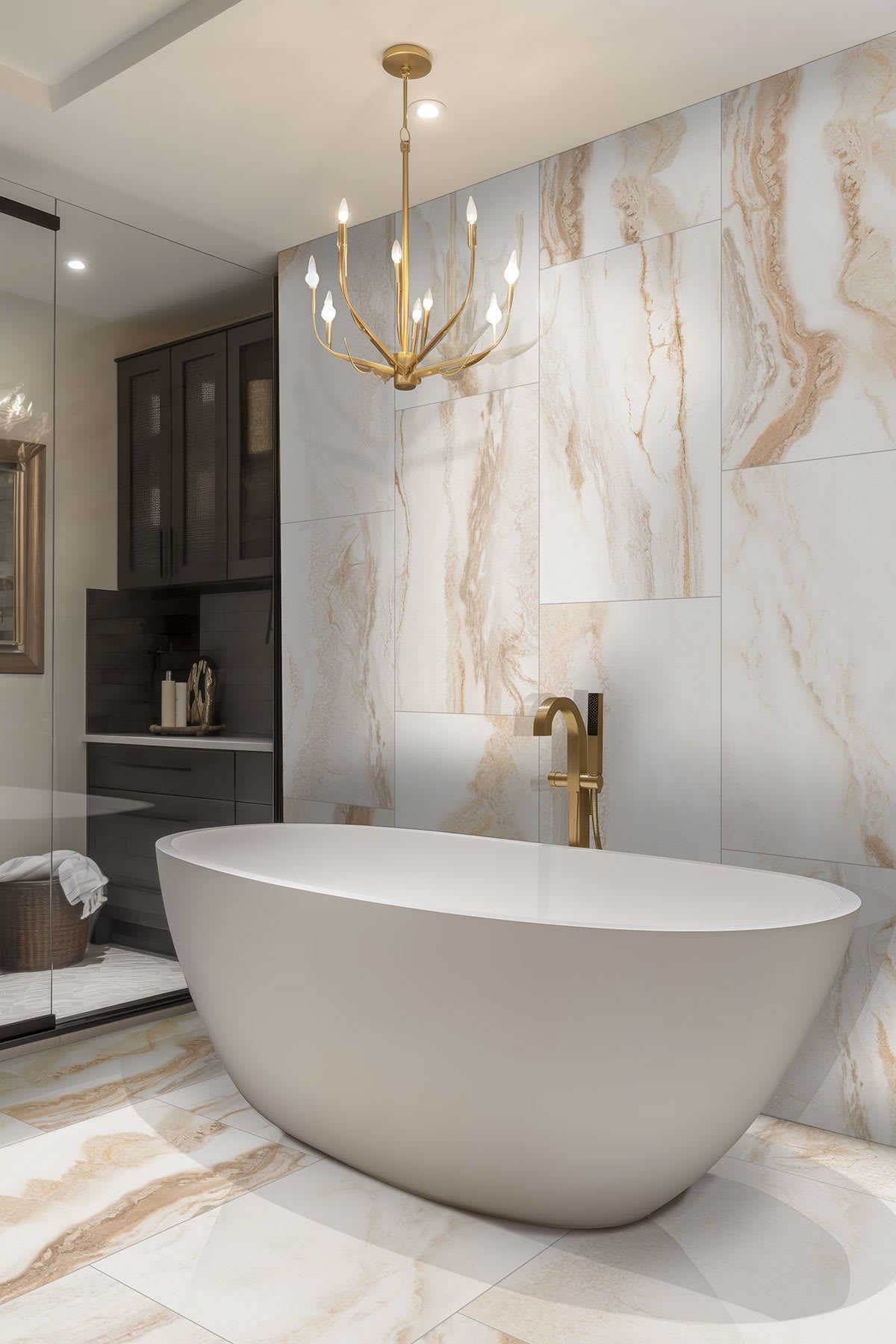 Experience the enduring grace of Nebula Almond as it envelops your space. Fashioned from premium porcelain, this 24” x 48” large-format tile radiates sophistication with its polished finish. Echoing the allure of desert dunes adorned with coffee-toned hues against creamy white, it embodies the essence of Skyline White marble's distinctive charm. With its mesmerizing design featuring long blurred veins in perpetual motion, it infuses any setting with a dynamic energy. Whether gracing floors or walls, Nebula Almond transforms interiors with its captivating aesthetic, evoking the luxurious ambiance of nature's awe-inspiring landscapes.