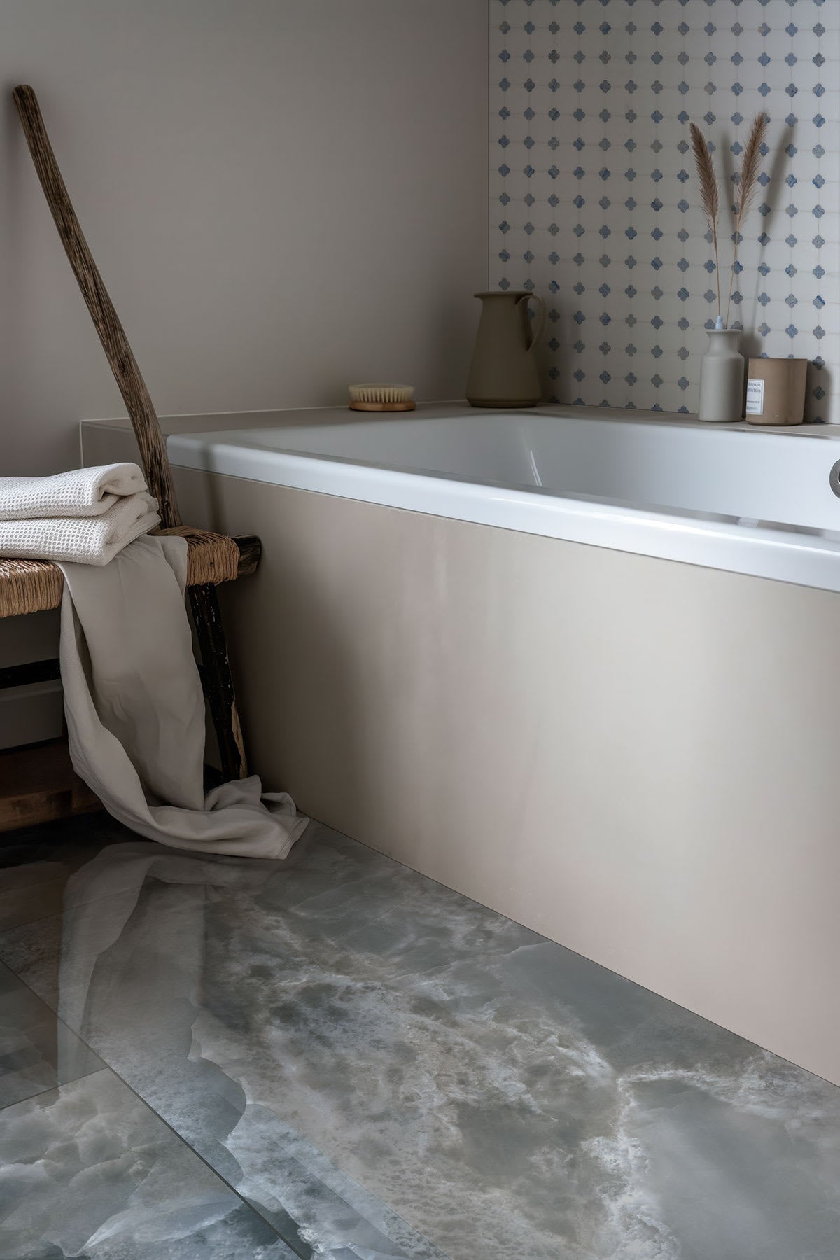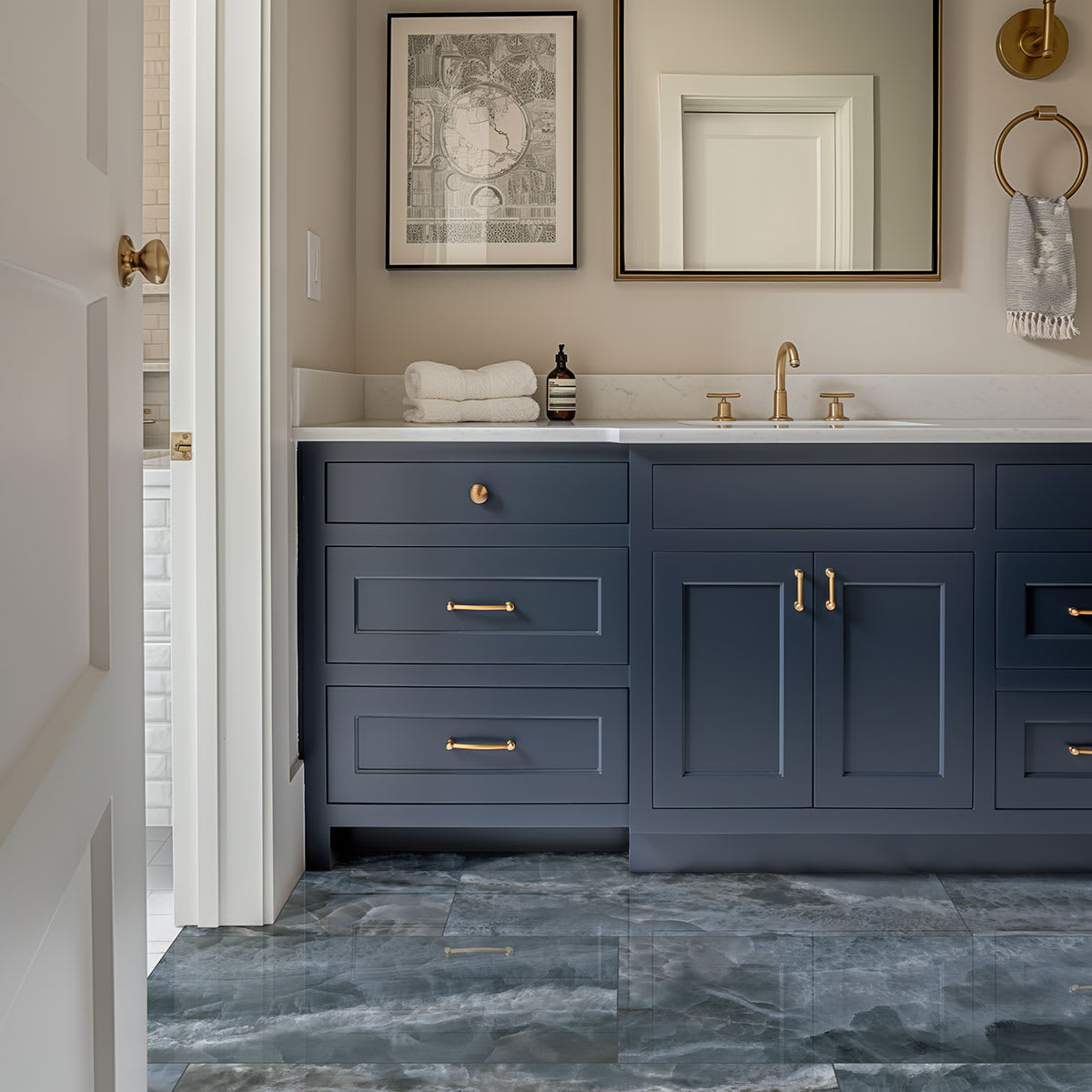 Reveal the captivating beauty of Tourmaline Porcelain Tile, designed in expansive 24” x 48” dimensions for a bold and dramatic effect. Masterfully crafted to showcase the stunning essence of onyx, this tile captivates with deep layers of dark blue, white, and black hues, intertwined with bold veining that echoes the power of stormy ocean waves. Perfect for transforming floors and walls in any room or space, its rectified edges ensure clean, seamless lines with minimal grout. The polished finish exudes sophistication, effortlessly merging style and functionality. Easy to install while delivering flawless results, this versatile tile adds a touch of timelessness to any design vision.