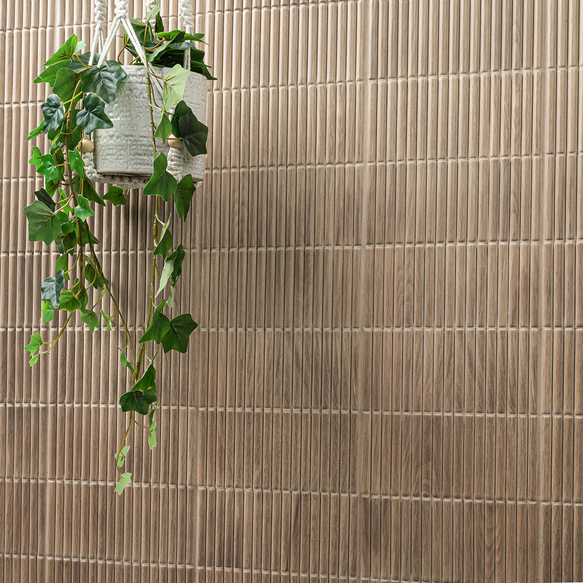 The Piano Camel Fluted Tile embraces contemporary elegance with a captivating brown wood aesthetic. It features intricate grains enhanced by a modern matte finish that exudes timeless allure. This fluted tile's detailed 3D fluted pattern elevates its visual appeal and fosters dynamic light play, particularly in well-lit spaces like kitchens or bathrooms. Ideal for vertical applications such as fluted wall panels on waterfall island surrounds, accent walls, and more, it seamlessly enhances the design of residential and commercial spaces, indoors or outdoors, with inviting charm.