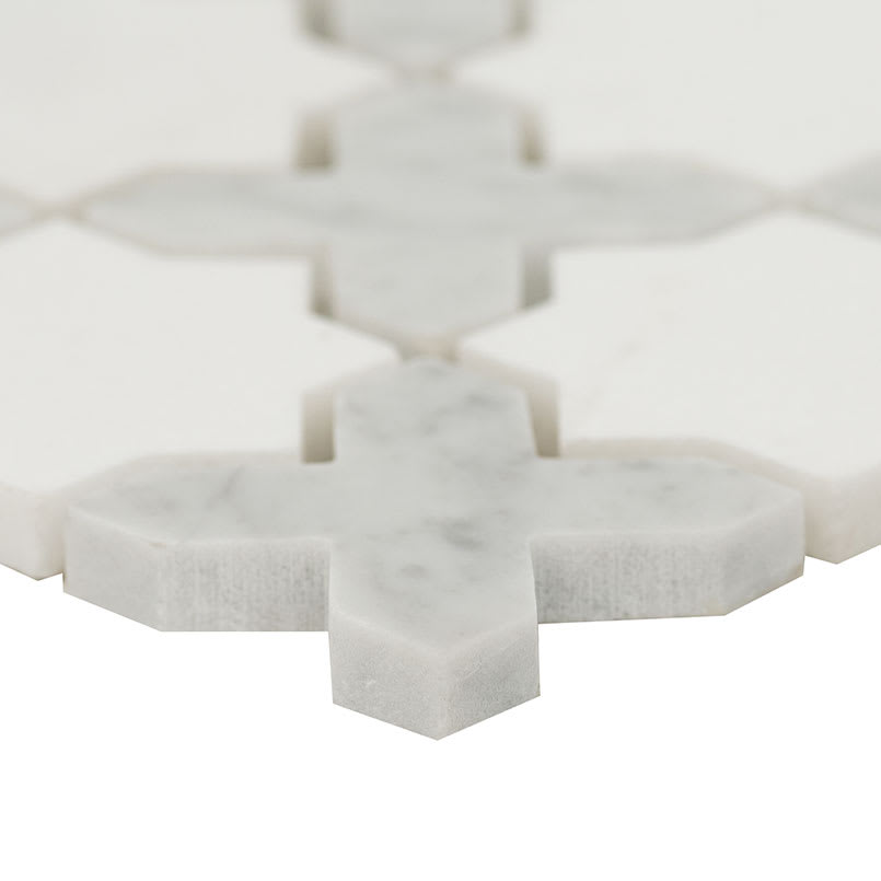 Add charm and detail to your space with Vera Anne Pattern Polished Tile. Featuring a white background with dove grey crosses in a fun checkered pattern, the neutral palette of this genuine marble tile works with nearly any color scheme. It’s an ideal choice for kitchen backsplash, fireplace façades, shower surrounds, bathroom vanity walls, and more. Not only stylish, but also durable and low maintenance, Vera Anne Pattern Polished Tile updates your space with the beauty of natural marble. Tiles are strategically arranged on mesh backed sheets for simplified installation and professional look.