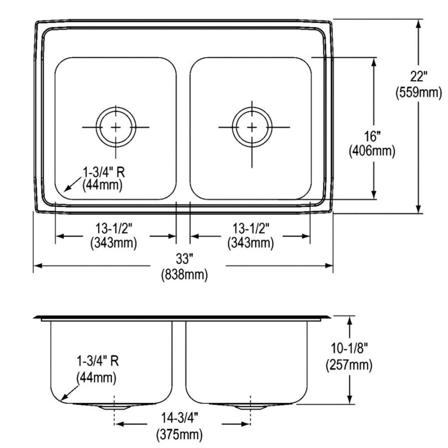 Lustertone™ Classic Double Bowl Kitchen Sink, Top Mount, 33 x 22 in, 10 in Bowl Depth, 3-Hole, 18 ga Lustrous Satin Steel, Stainless