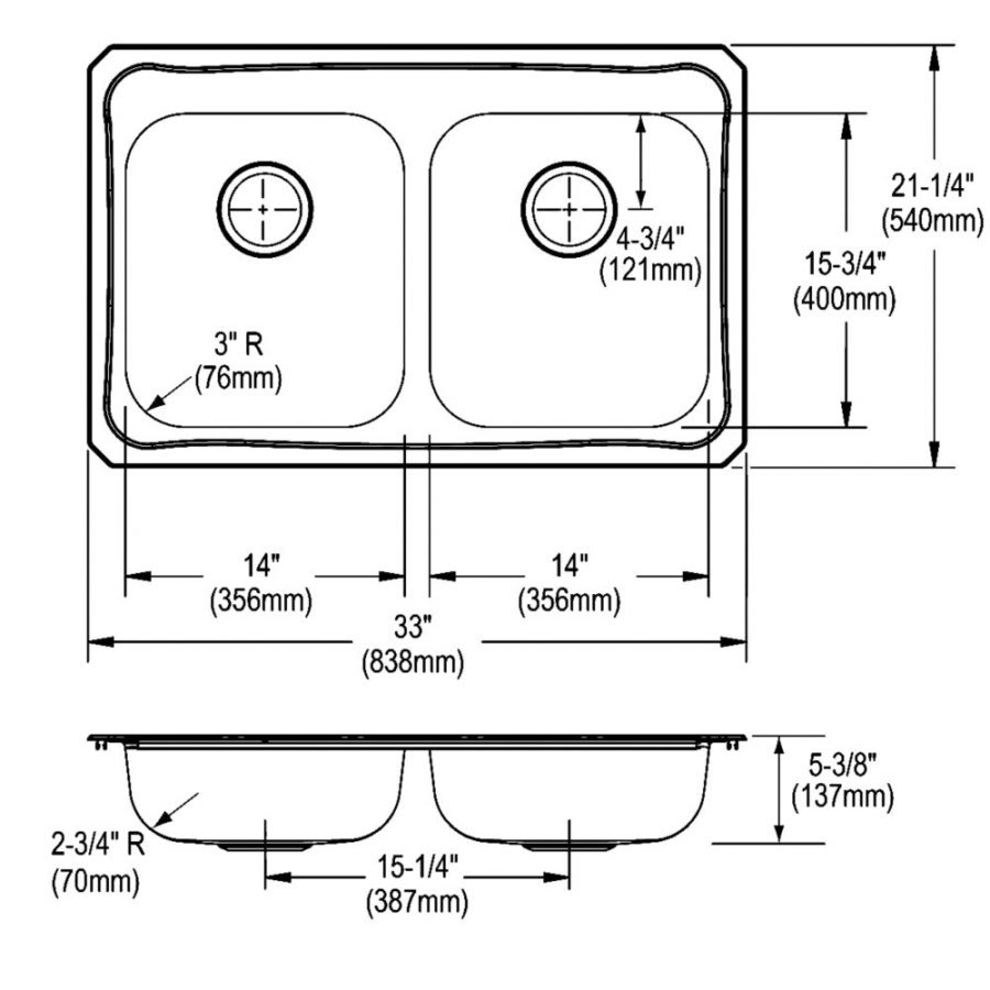 Celebrity Double Bowl Kitchen Sink, Top Mount, ADA, 33 x 21-1/4 in, 5-1/4 in Bowl Depth, 3-Hole, 20 ga Brushed Satin Steel, Stainless
