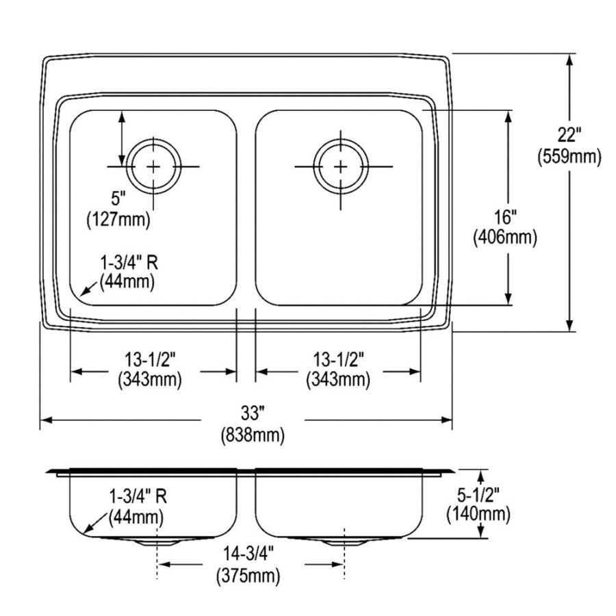 Lustertone™ Classic Double Bowl Kitchen Sink, Top Mount, ADA, 33 x 22 in, 5-1/8 in Bowl Depth, 4-Hole, 18 ga Lustrous Satin Steel, Stainless