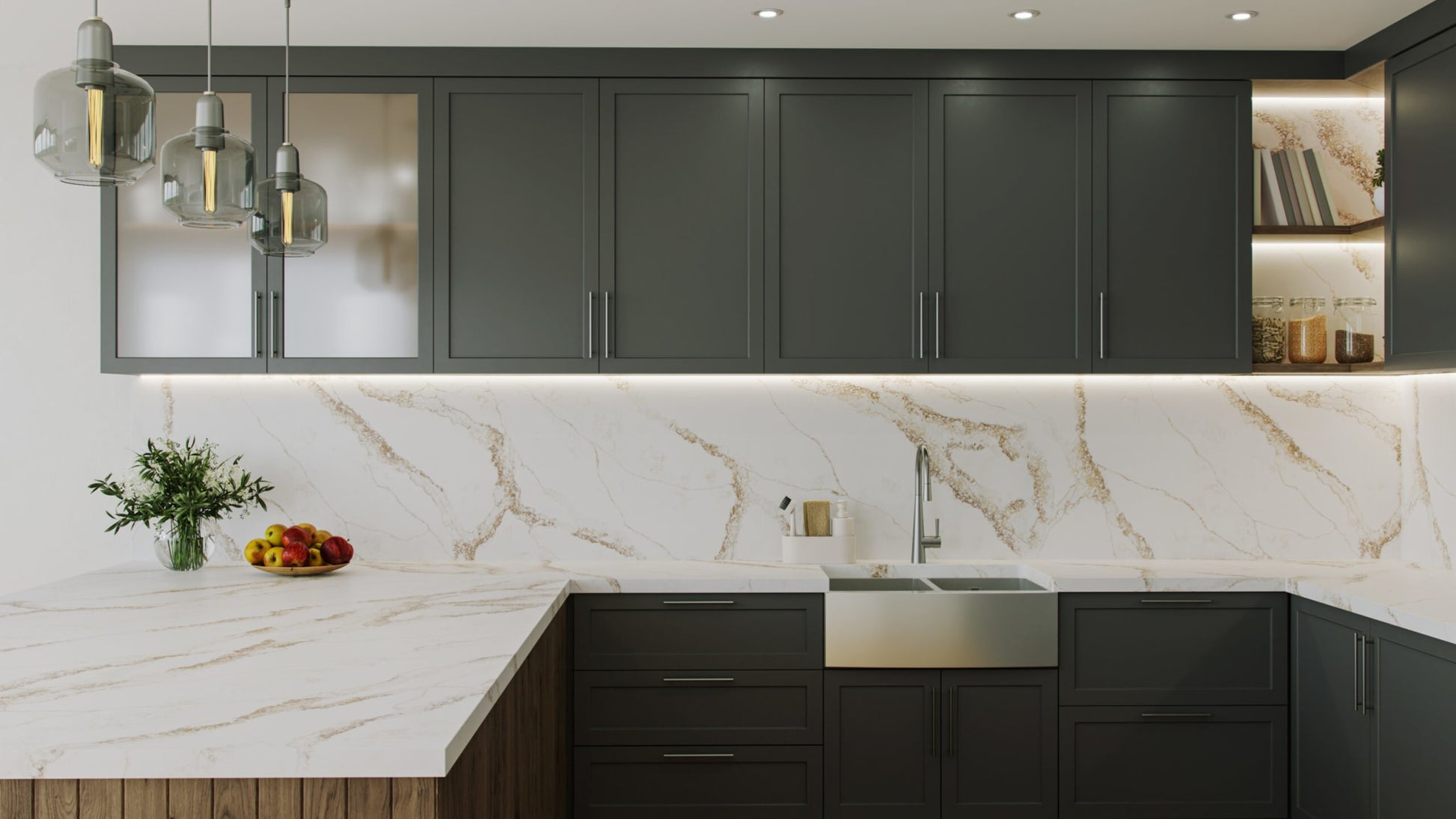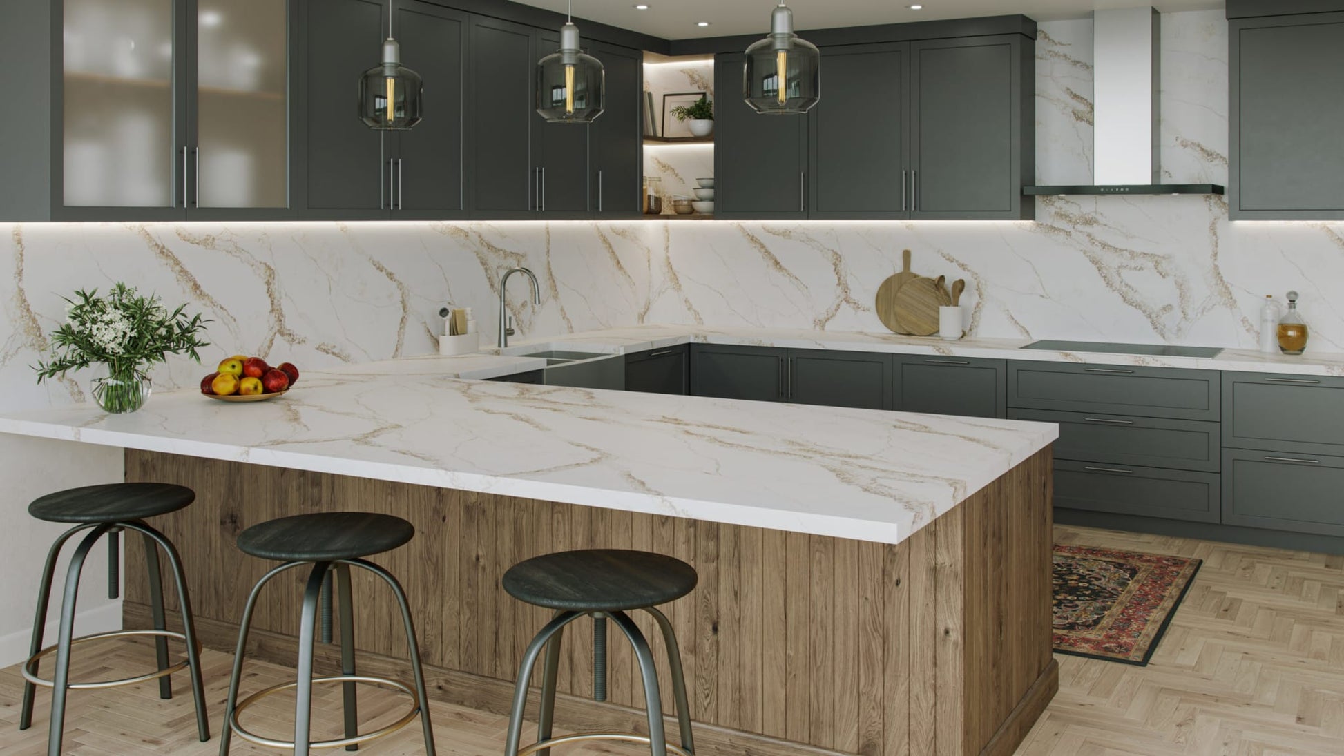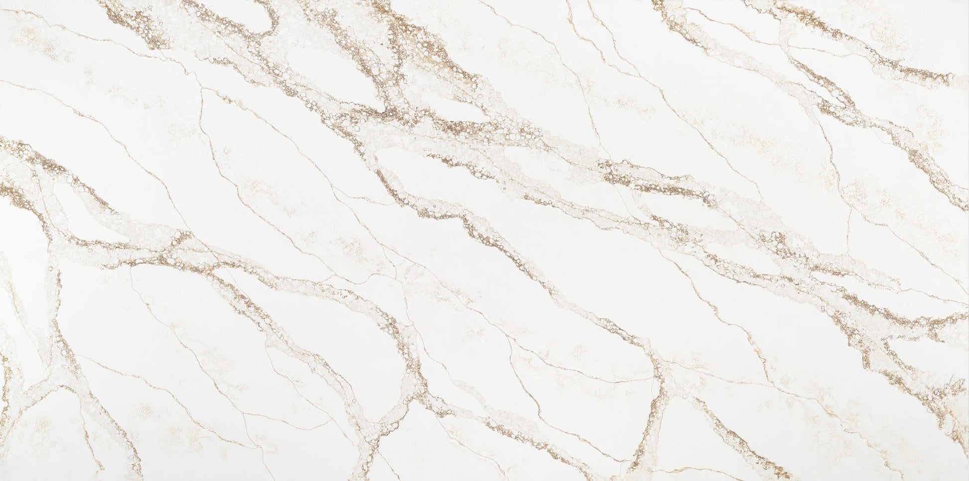 Calacatta marble-inspired quartz, featuring a bright white background with dynamic rust veining
