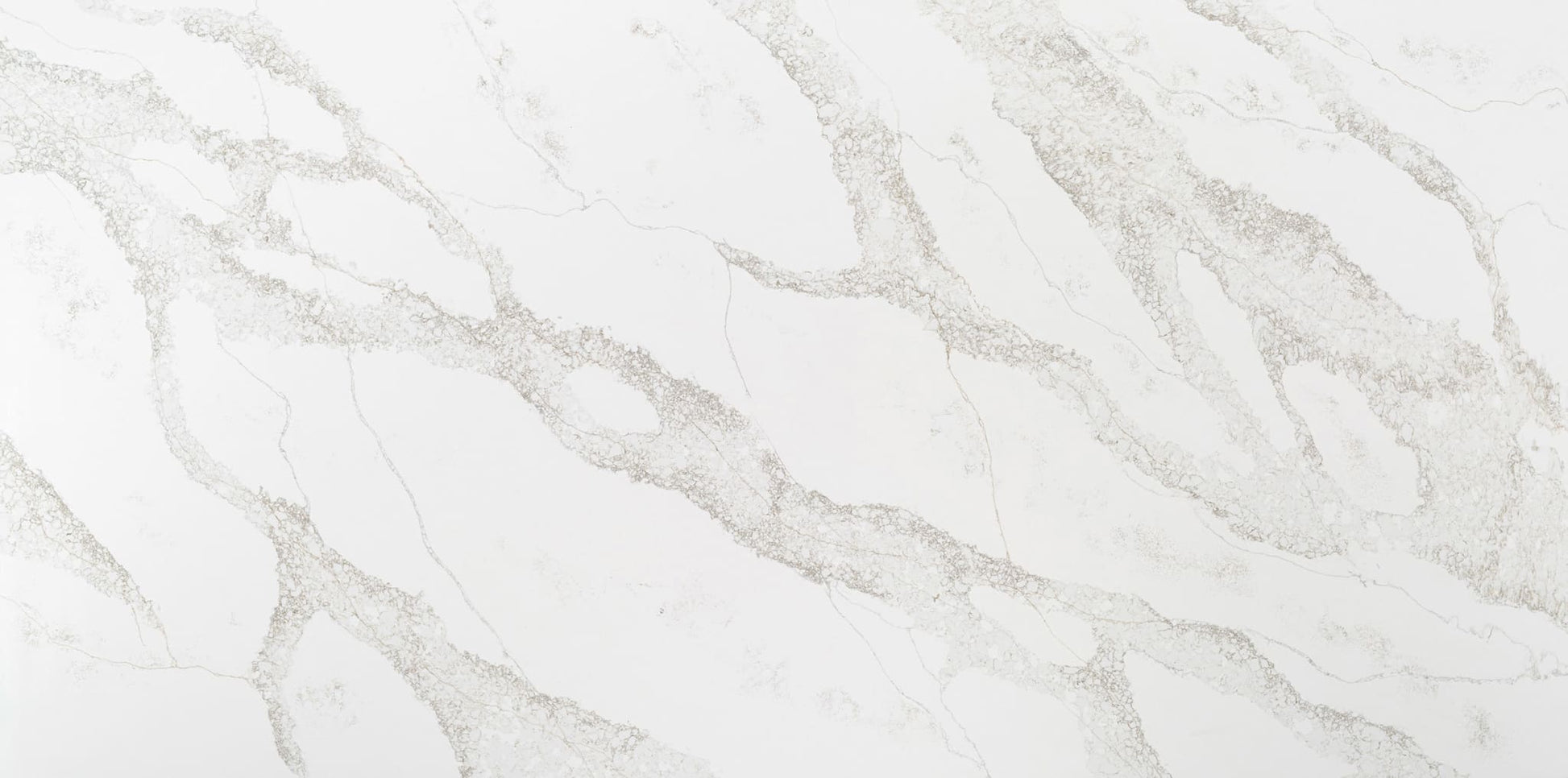 Calacatta marble-inspired quartz, featuring a bright white background with dynamic cream and taupe veining