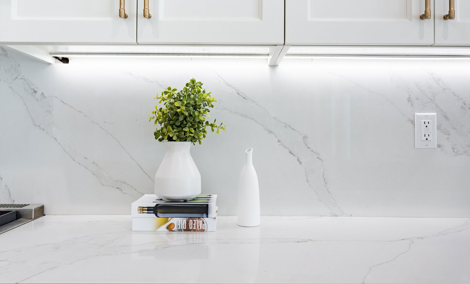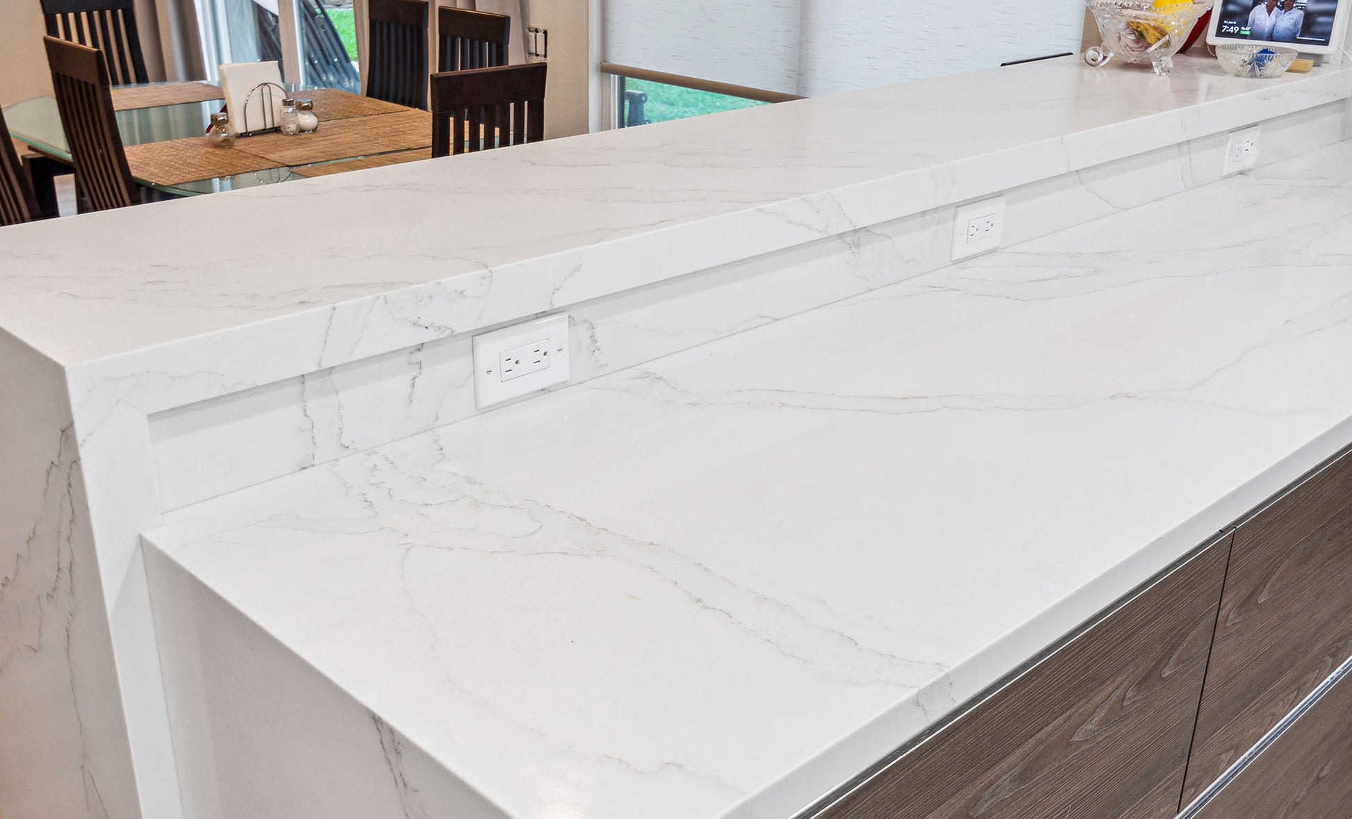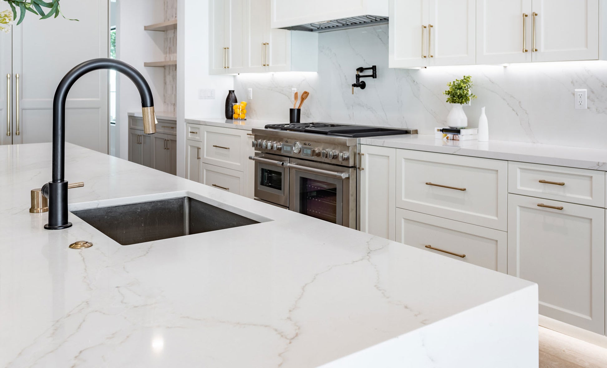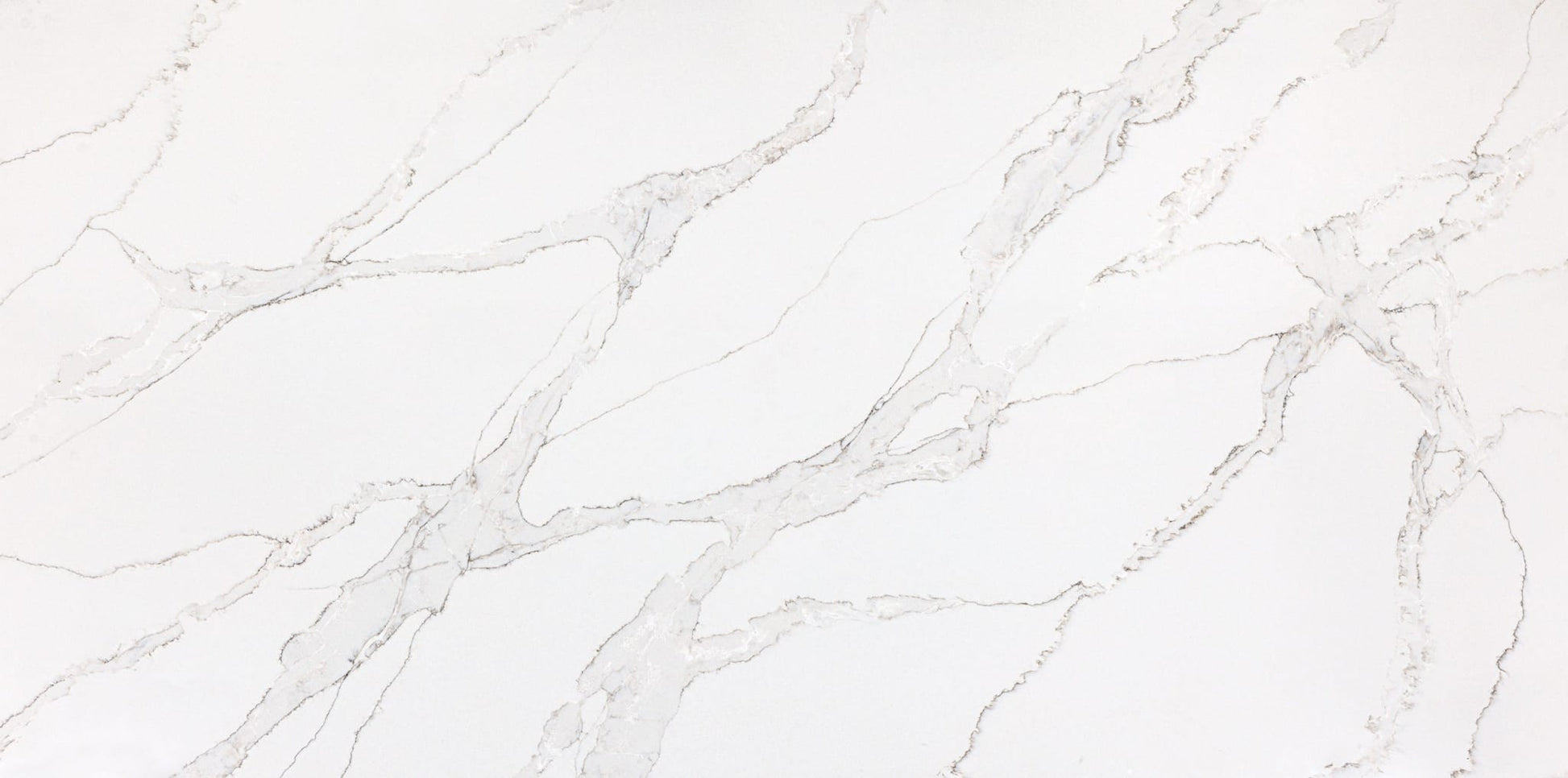 Calacatta marble-inspired quartz, featuring a white background with dynamic light grey and gold veining