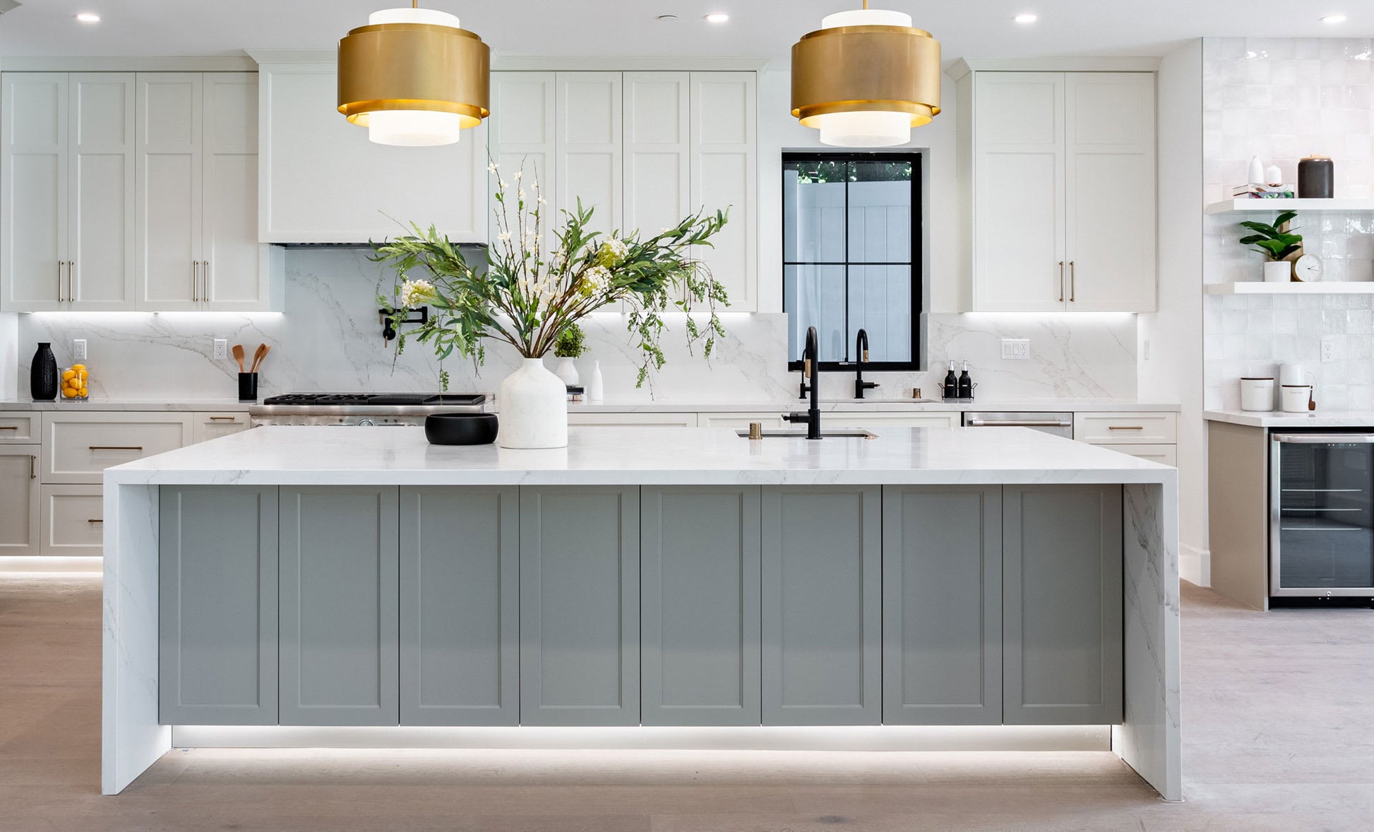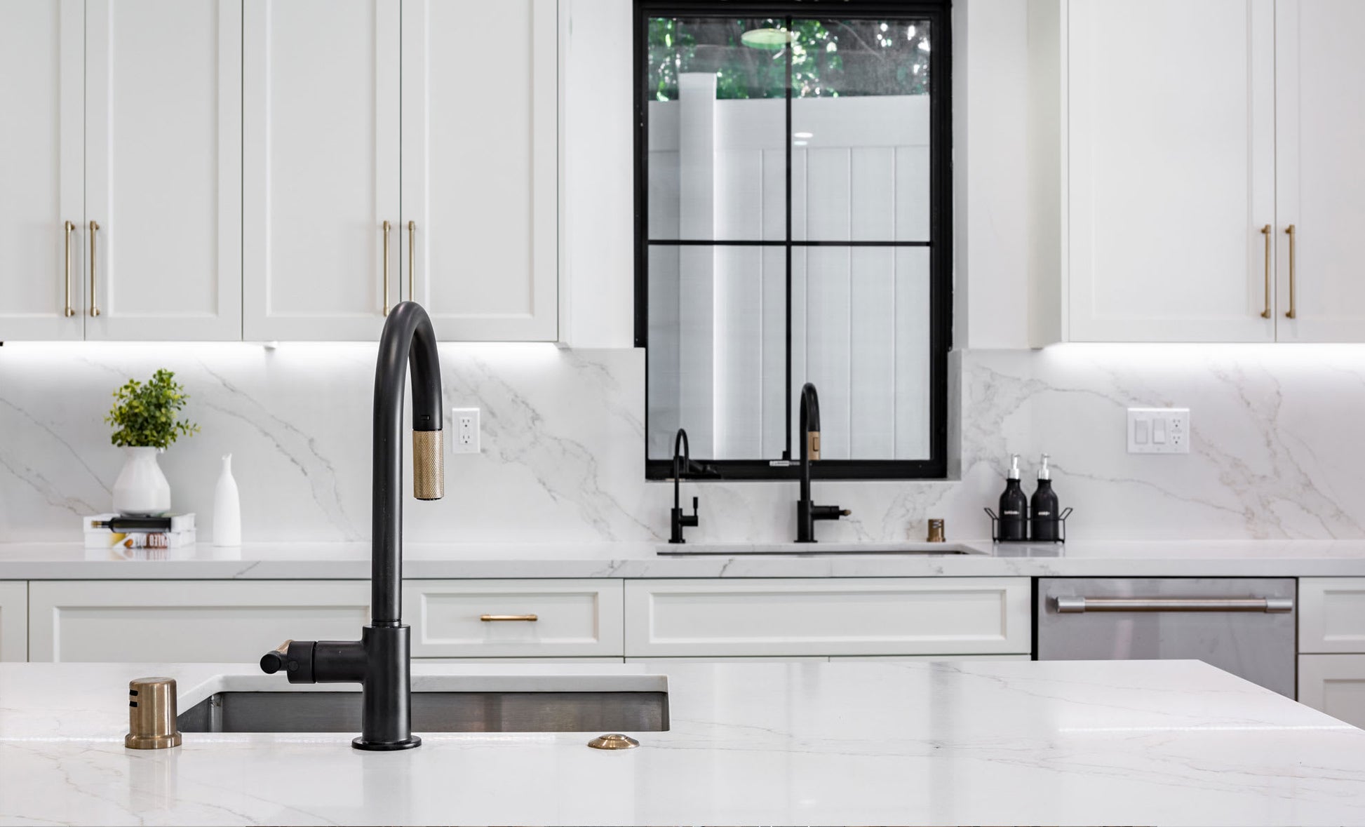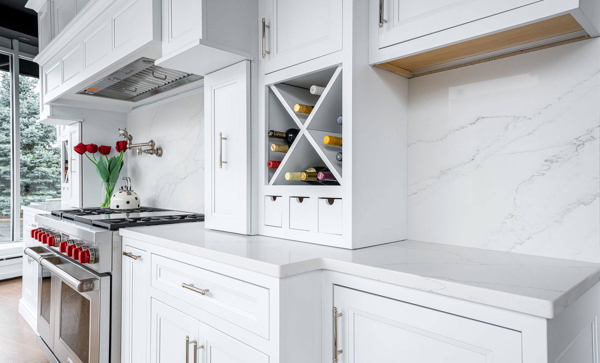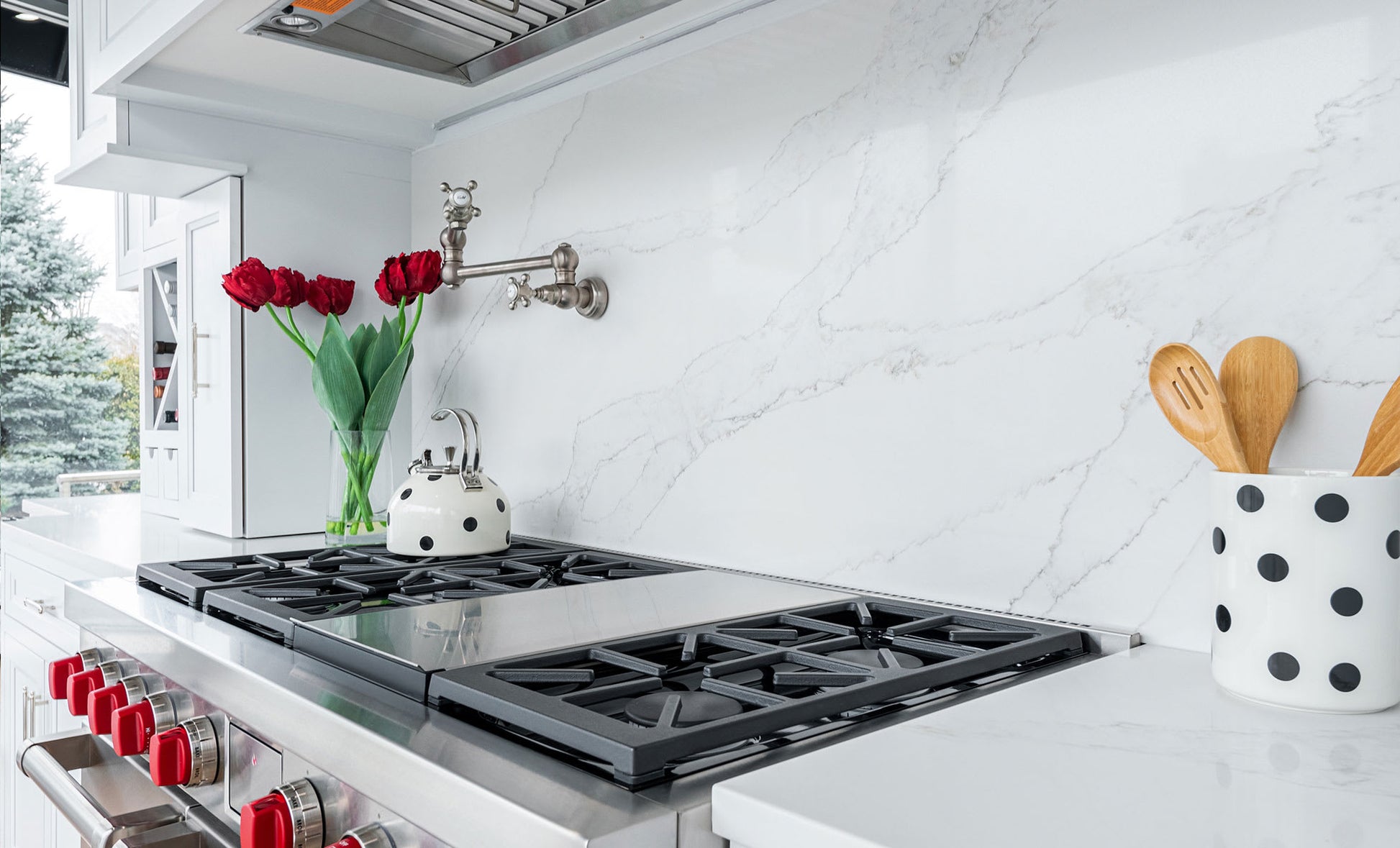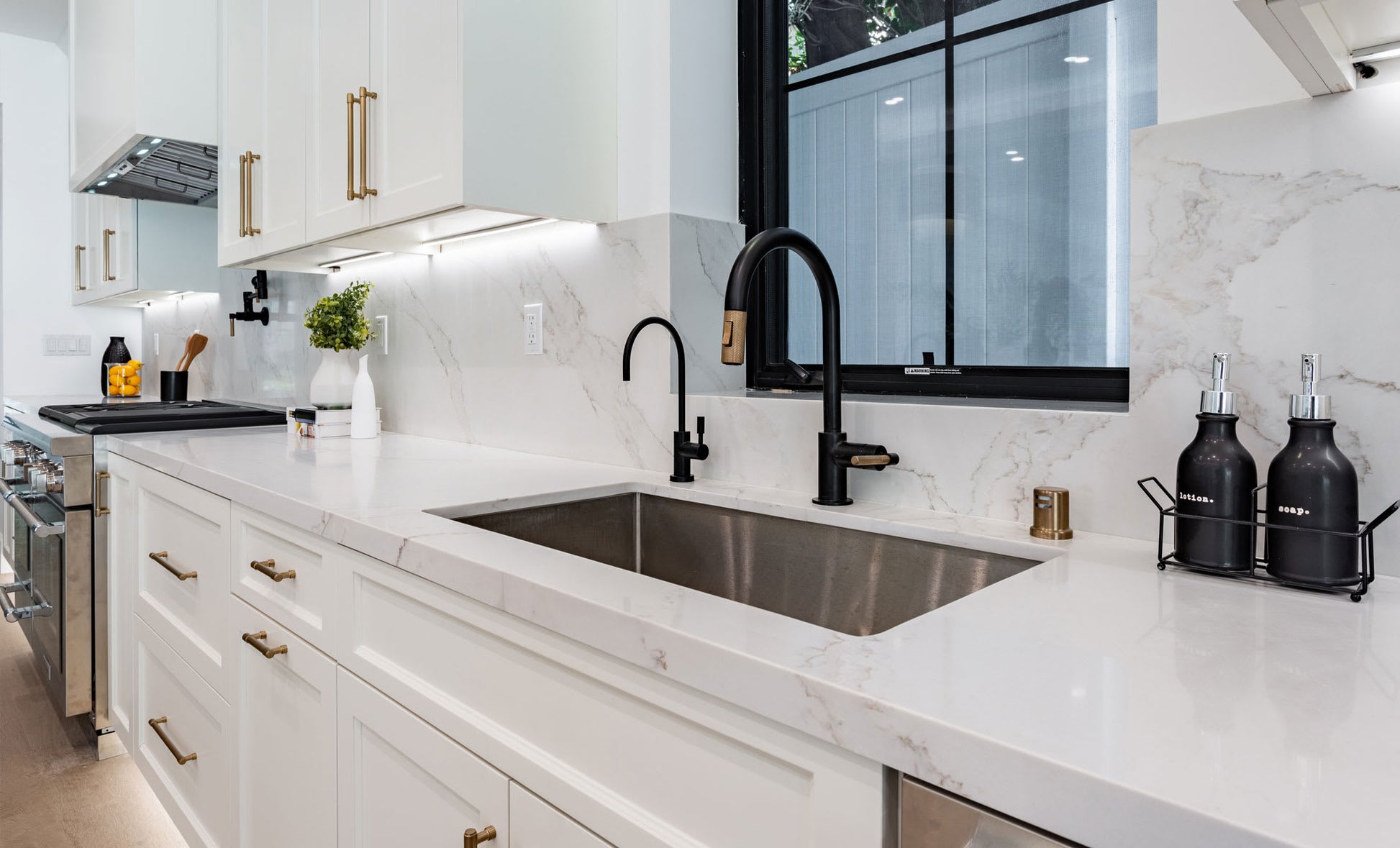 Calacatta marble-inspired quartz, featuring a white background with dynamic light grey and gold veining