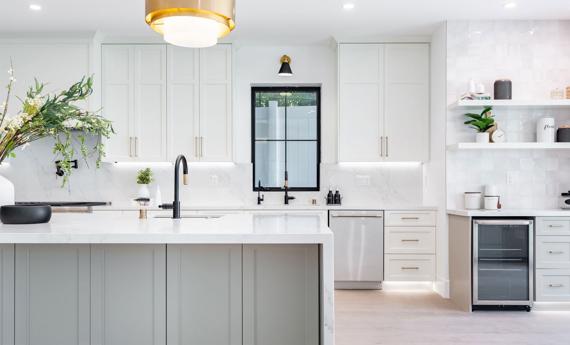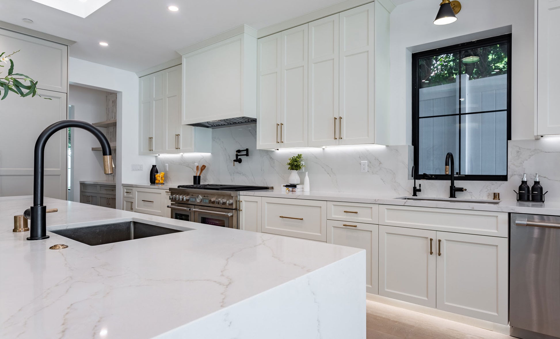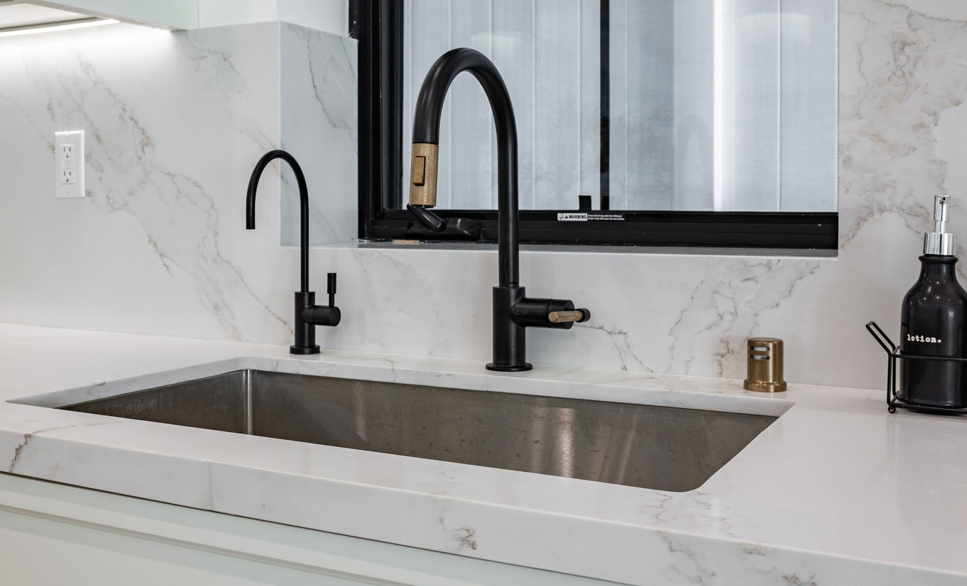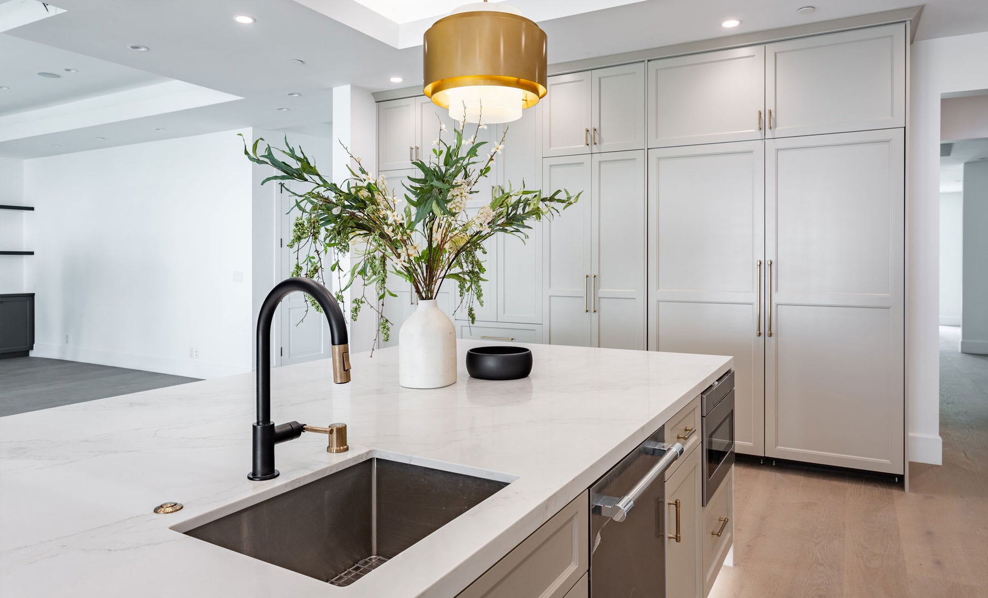 Calacatta marble-inspired quartz, featuring a white background with dynamic light grey and gold veining