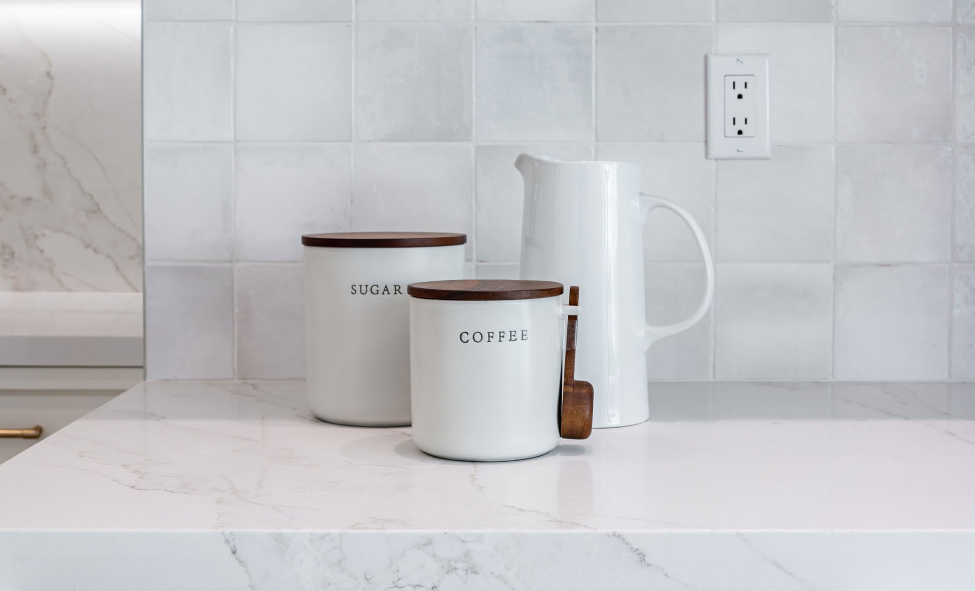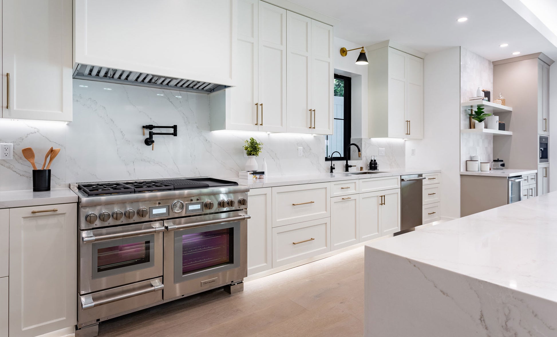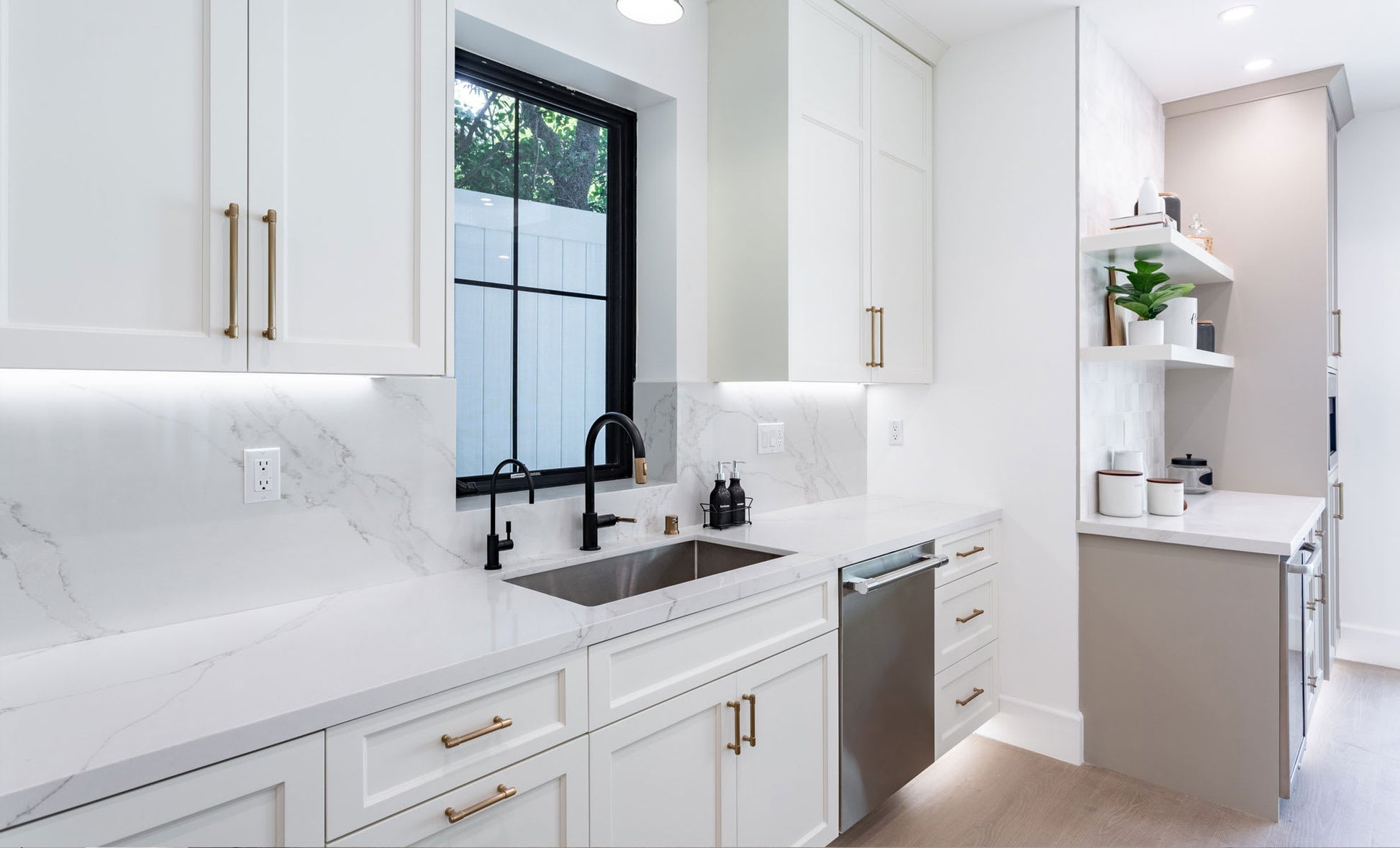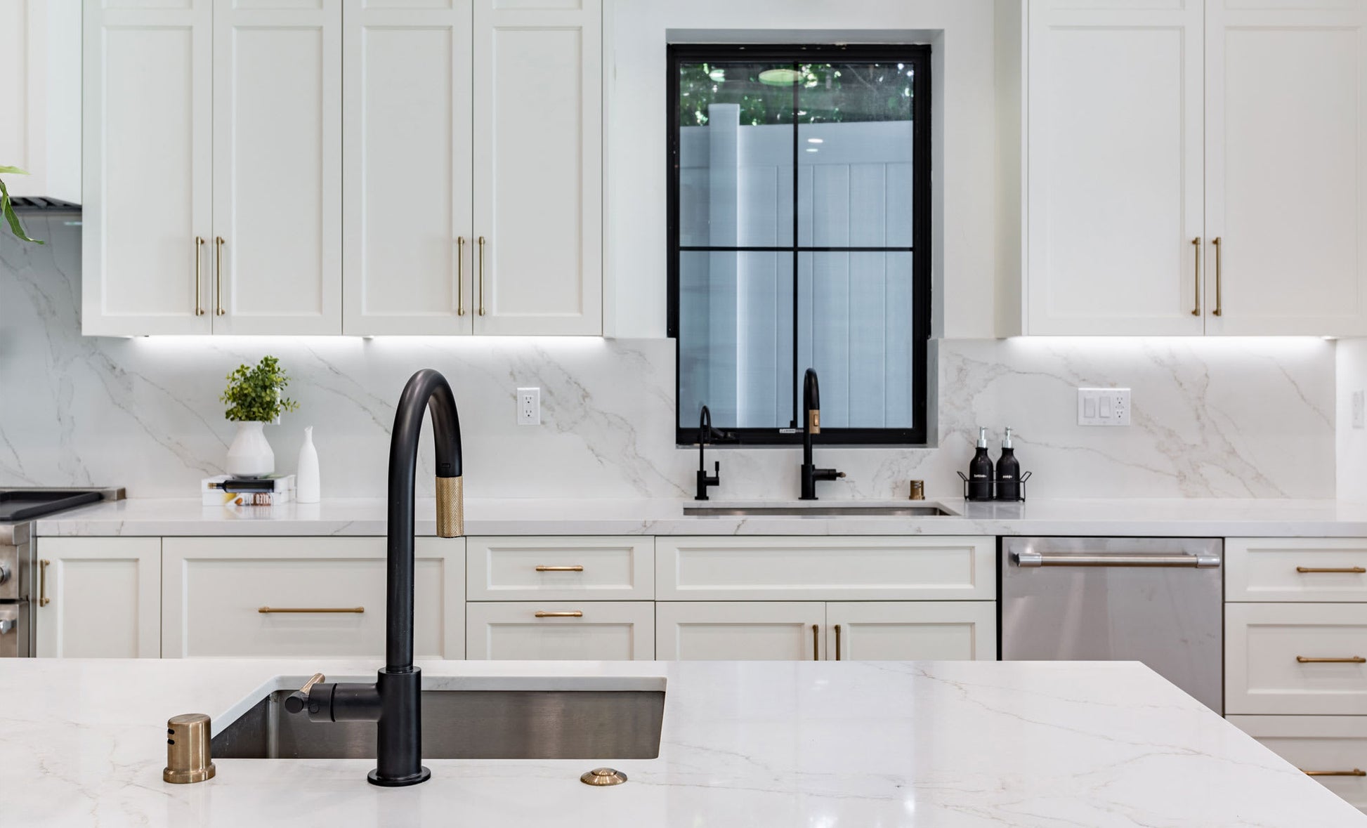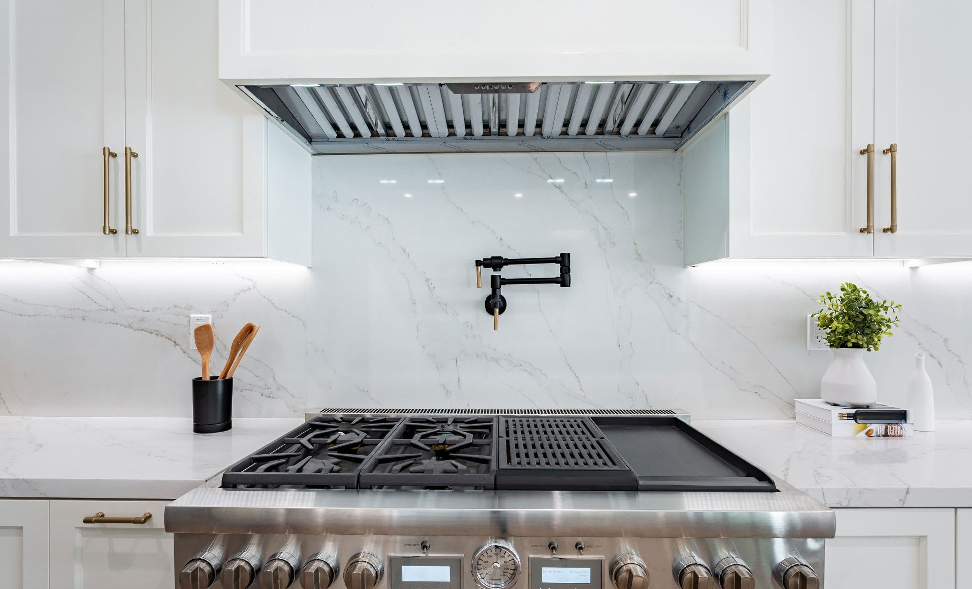 Calacatta marble-inspired quartz, featuring a white background with dynamic light grey and gold veining