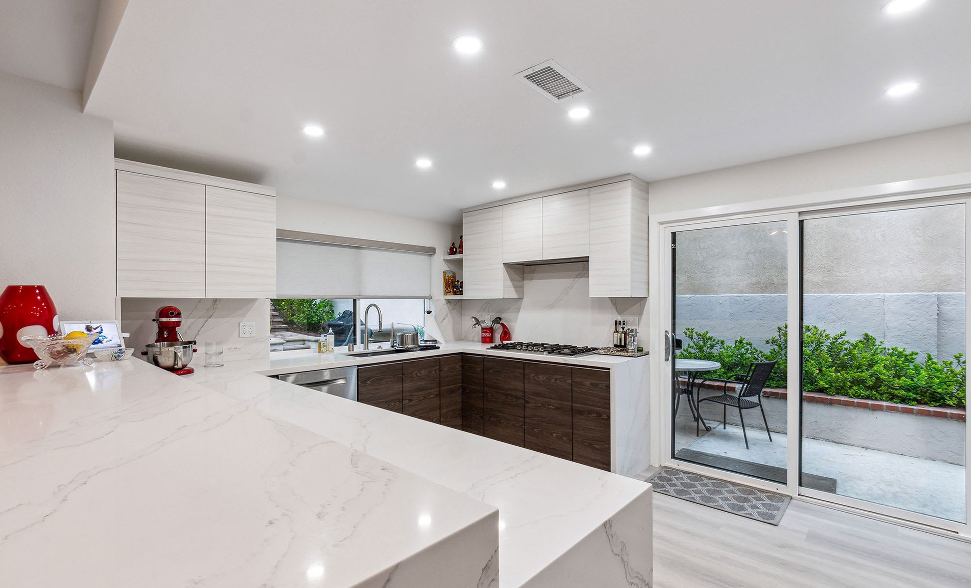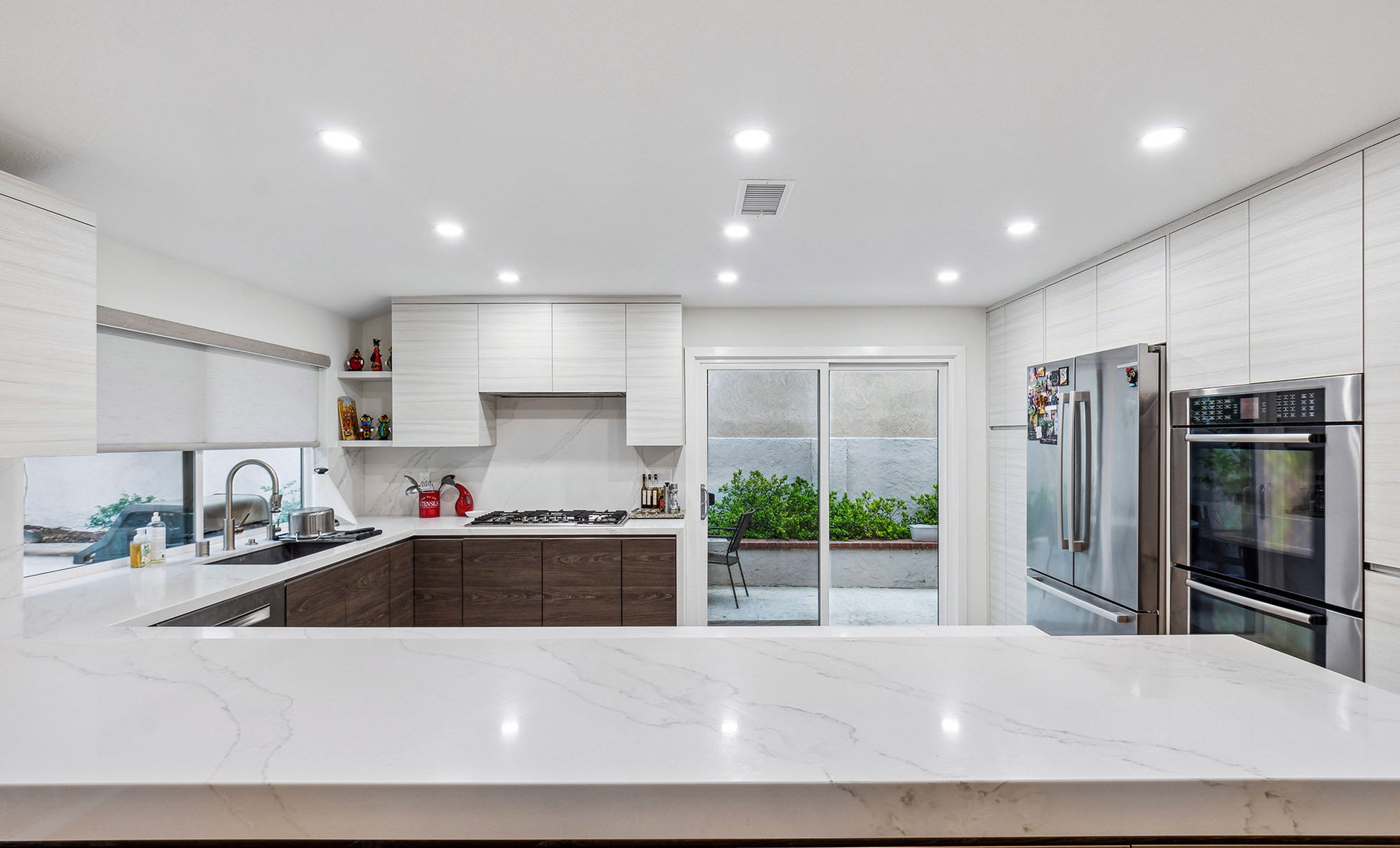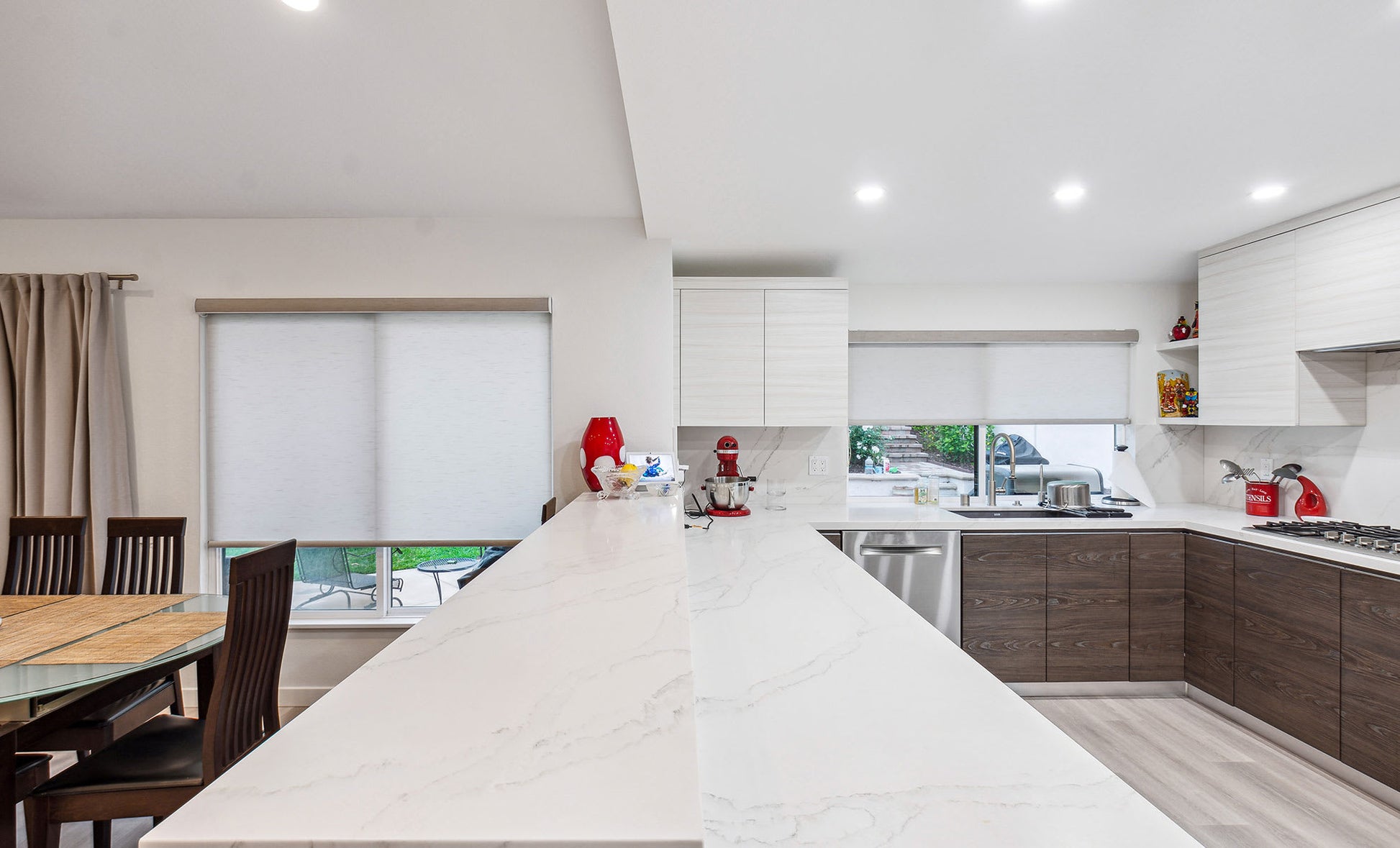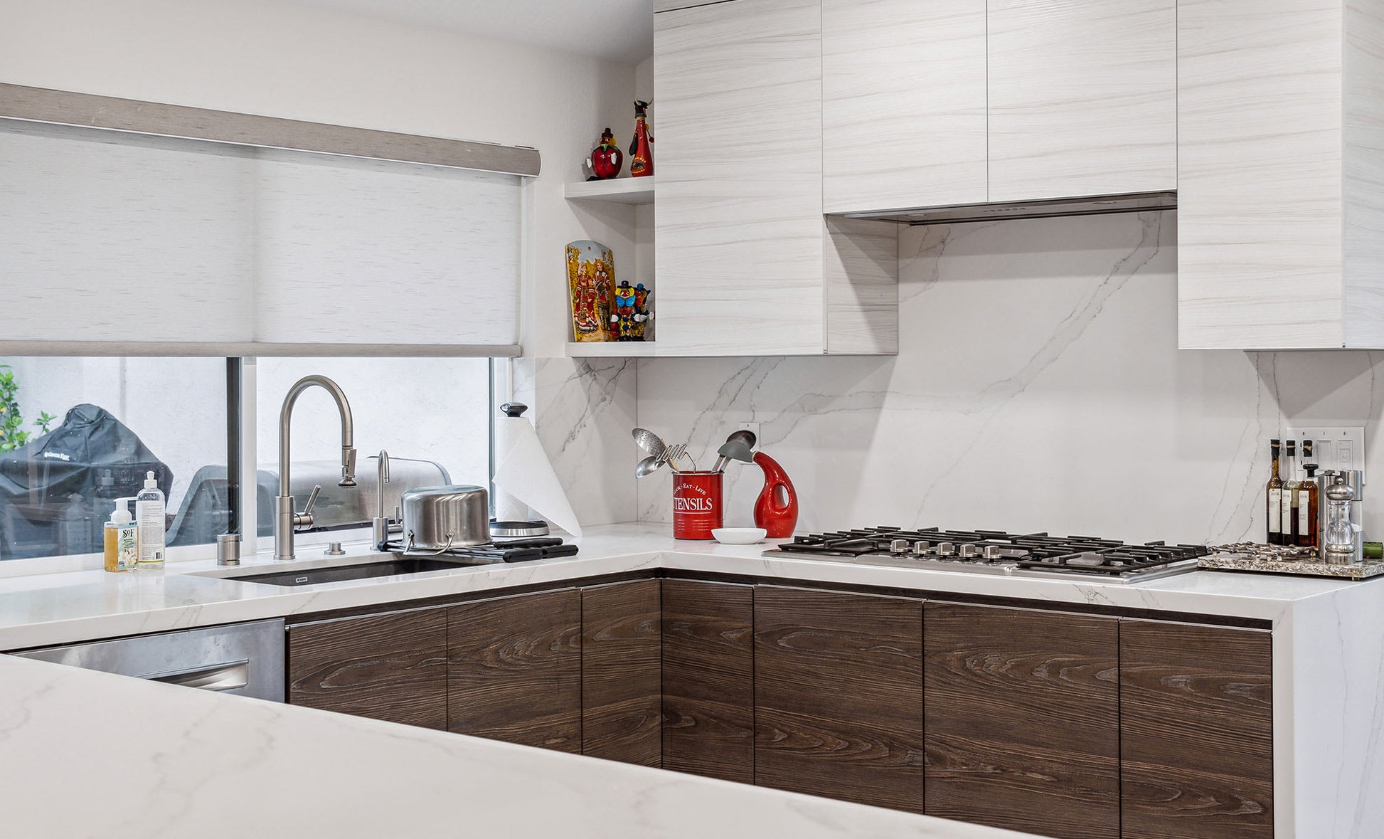 Calacatta marble-inspired quartz, featuring a white background with dynamic light grey and gold veining