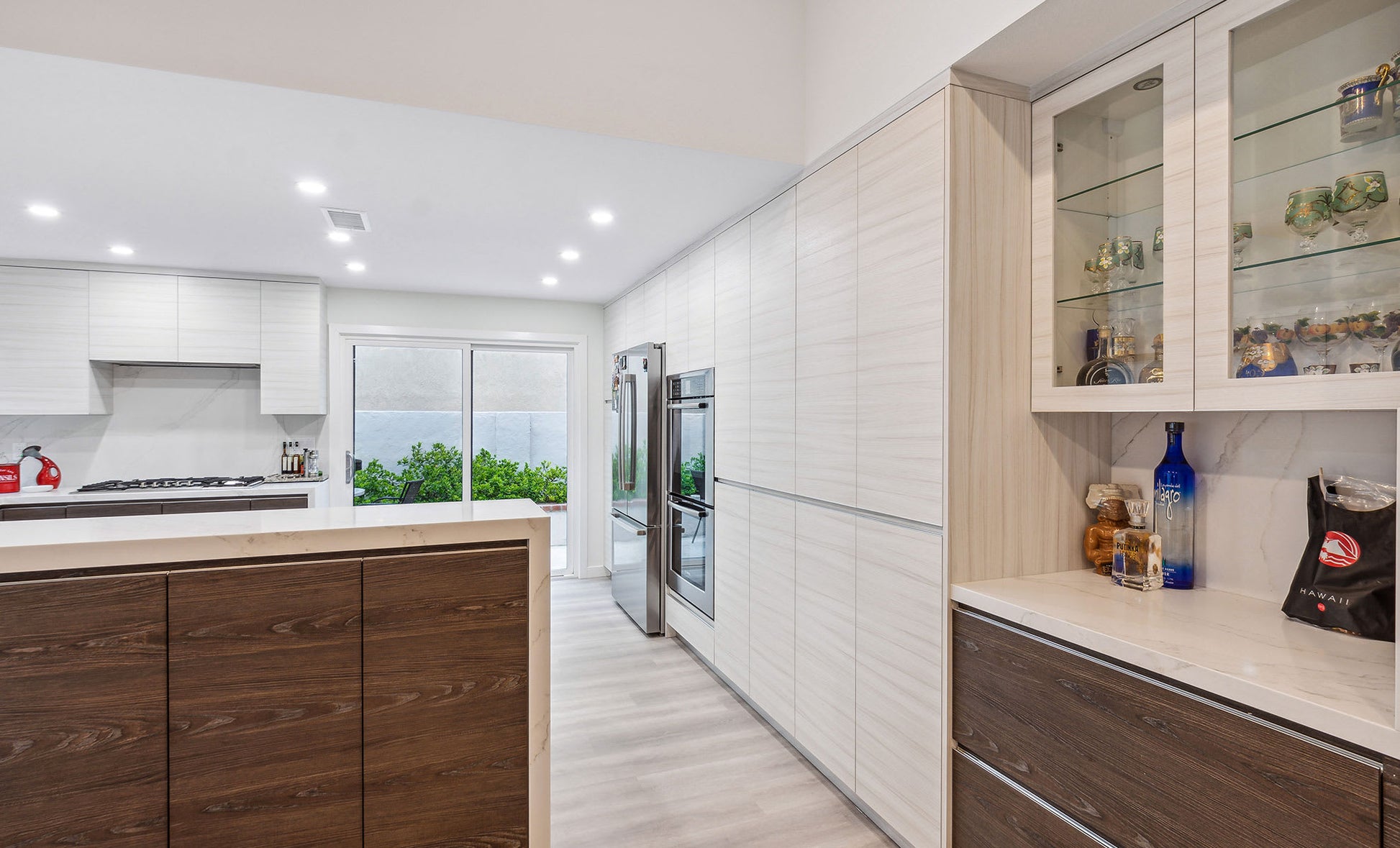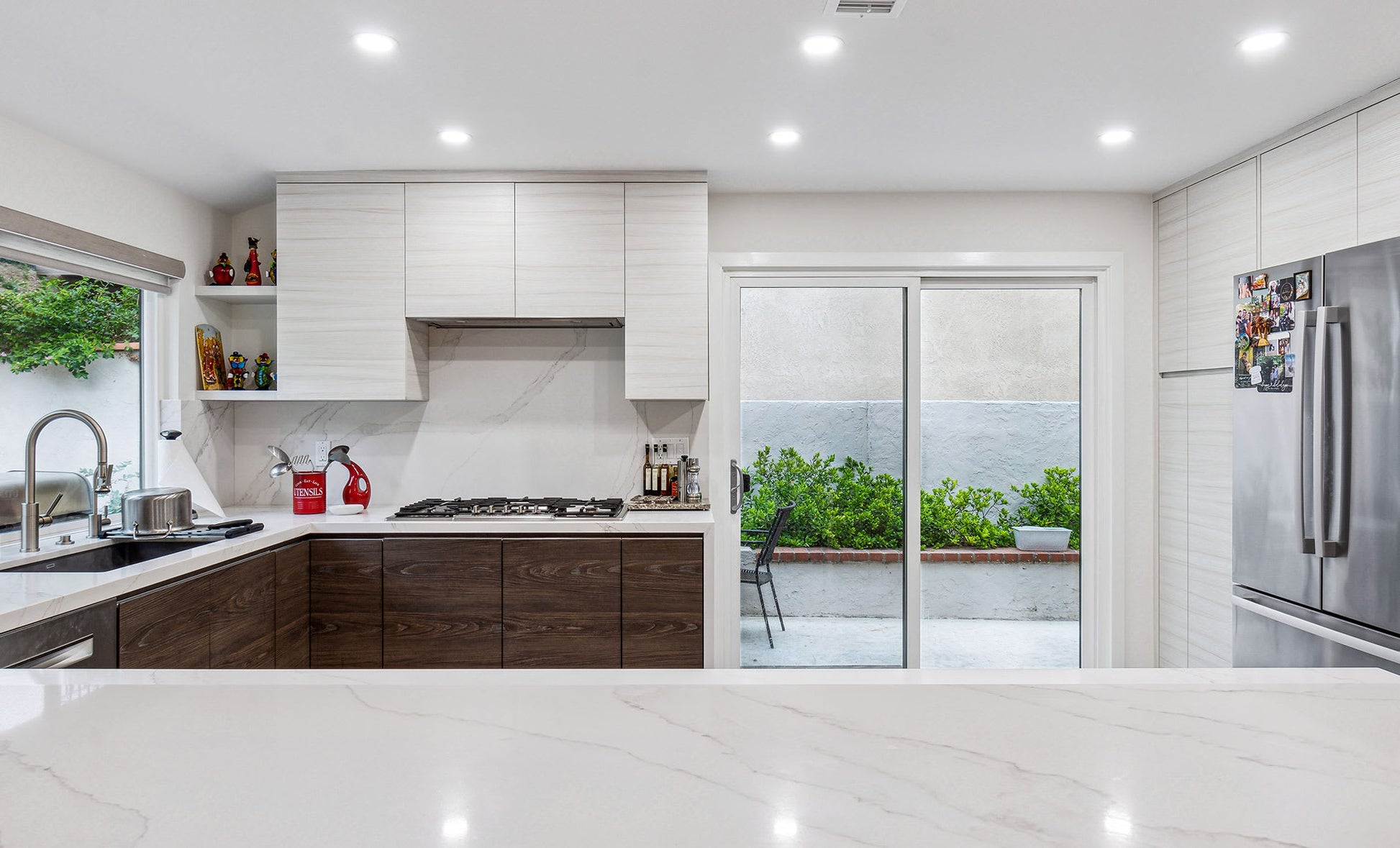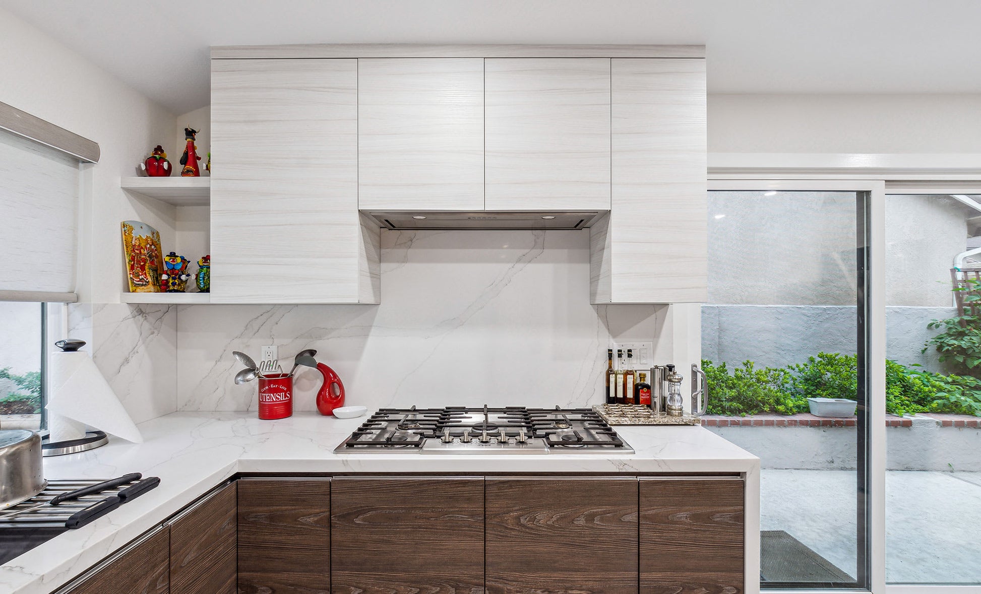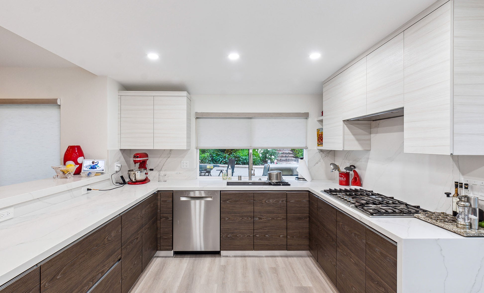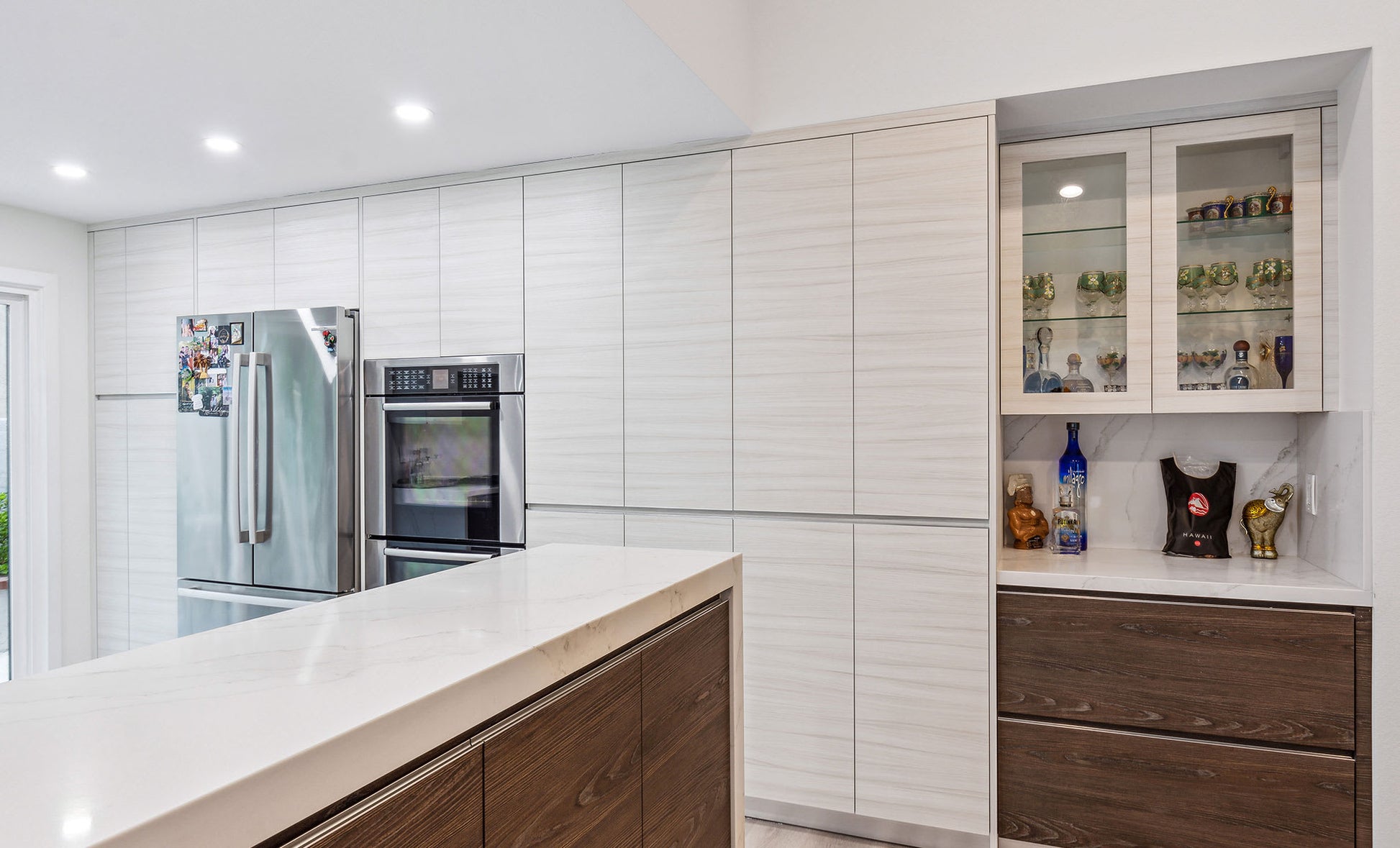 Calacatta marble-inspired quartz, featuring a white background with dynamic light grey and gold veining